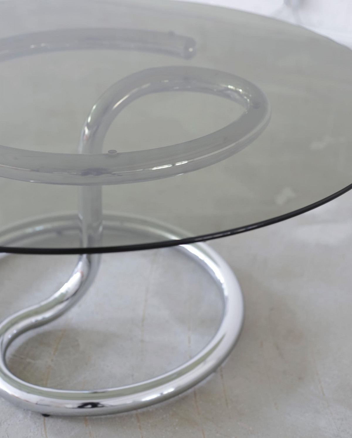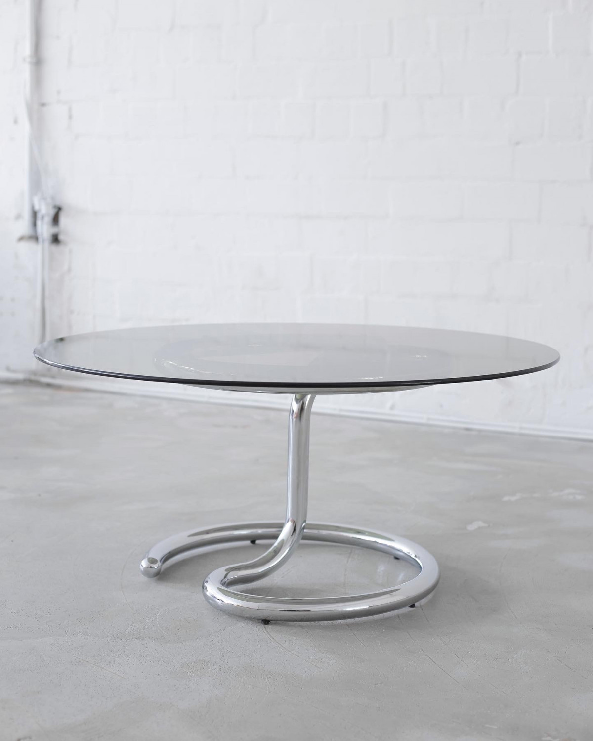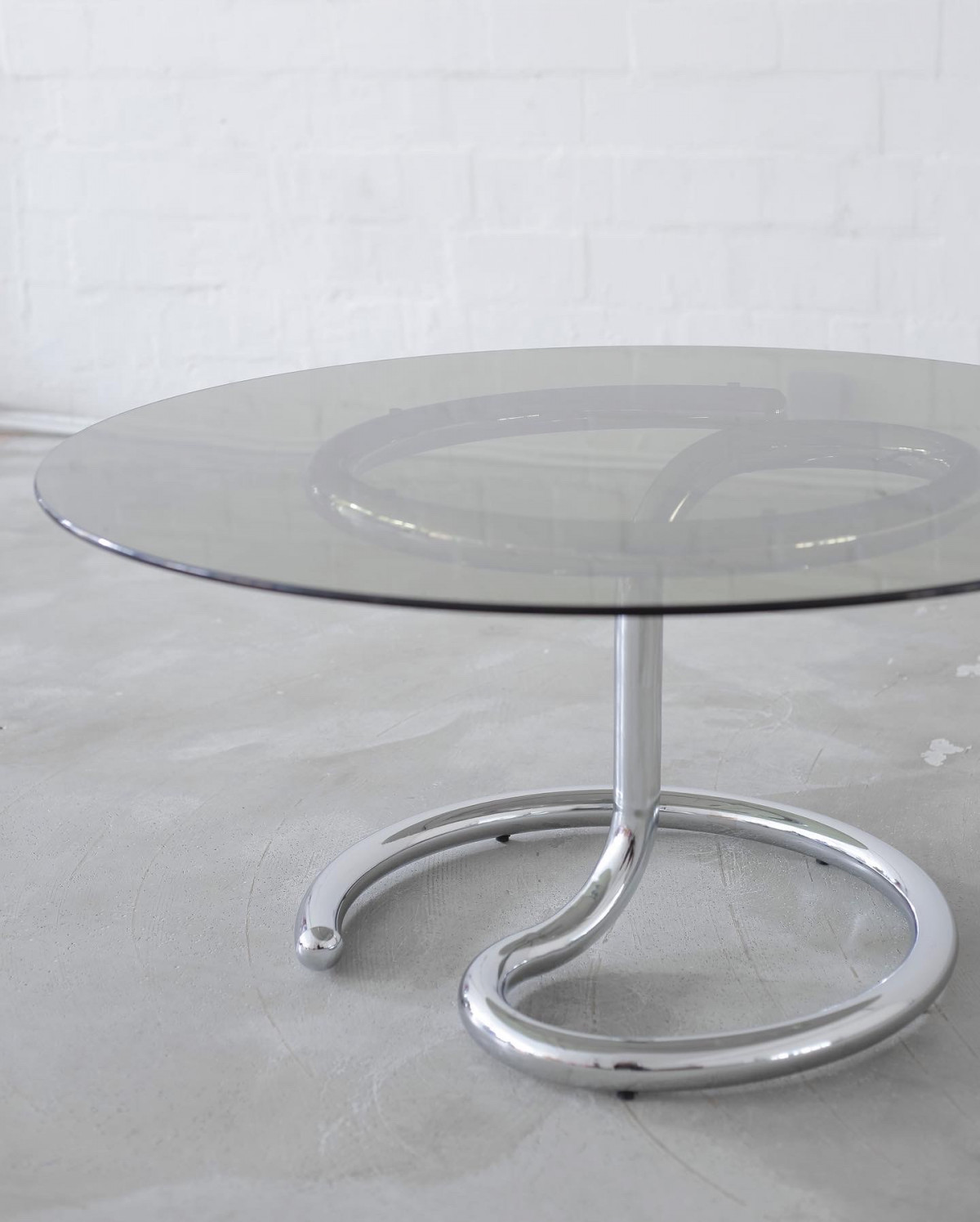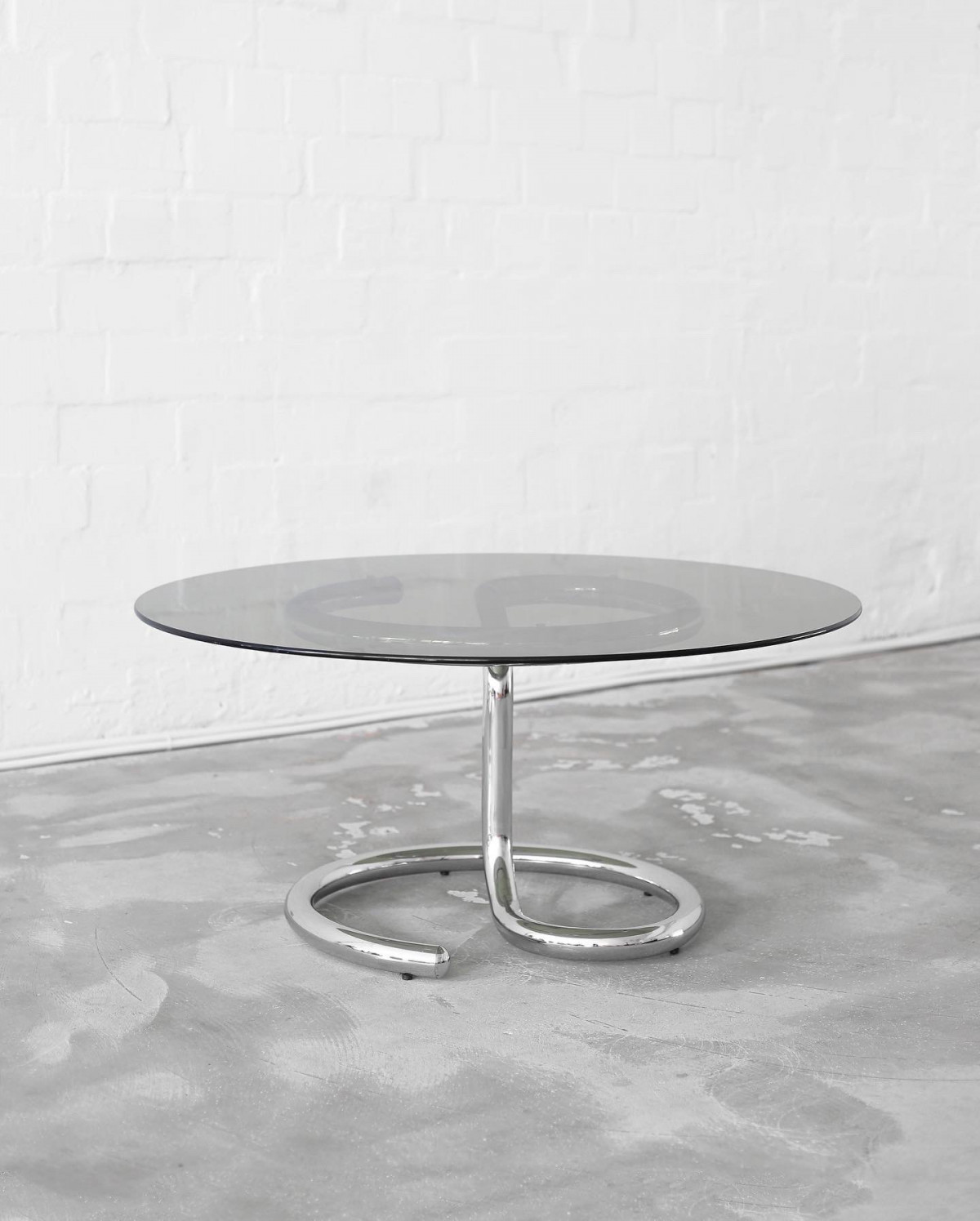 ANACONDA coffee table by Paul Tuttle for Strässle International. The distinctive table was manufactured in the 1970s in Switzerland, made of a chromium tubular base and a smoked glass top. In excellent vintage condition with natural signs of aging and use.