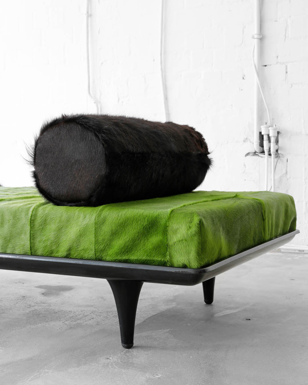 Refurbished by FREIKOERPER with remnants cowhide leather, featuring bold green and black tones, plus a matching roll cushion, it blends timeless design with a contemporary touch.