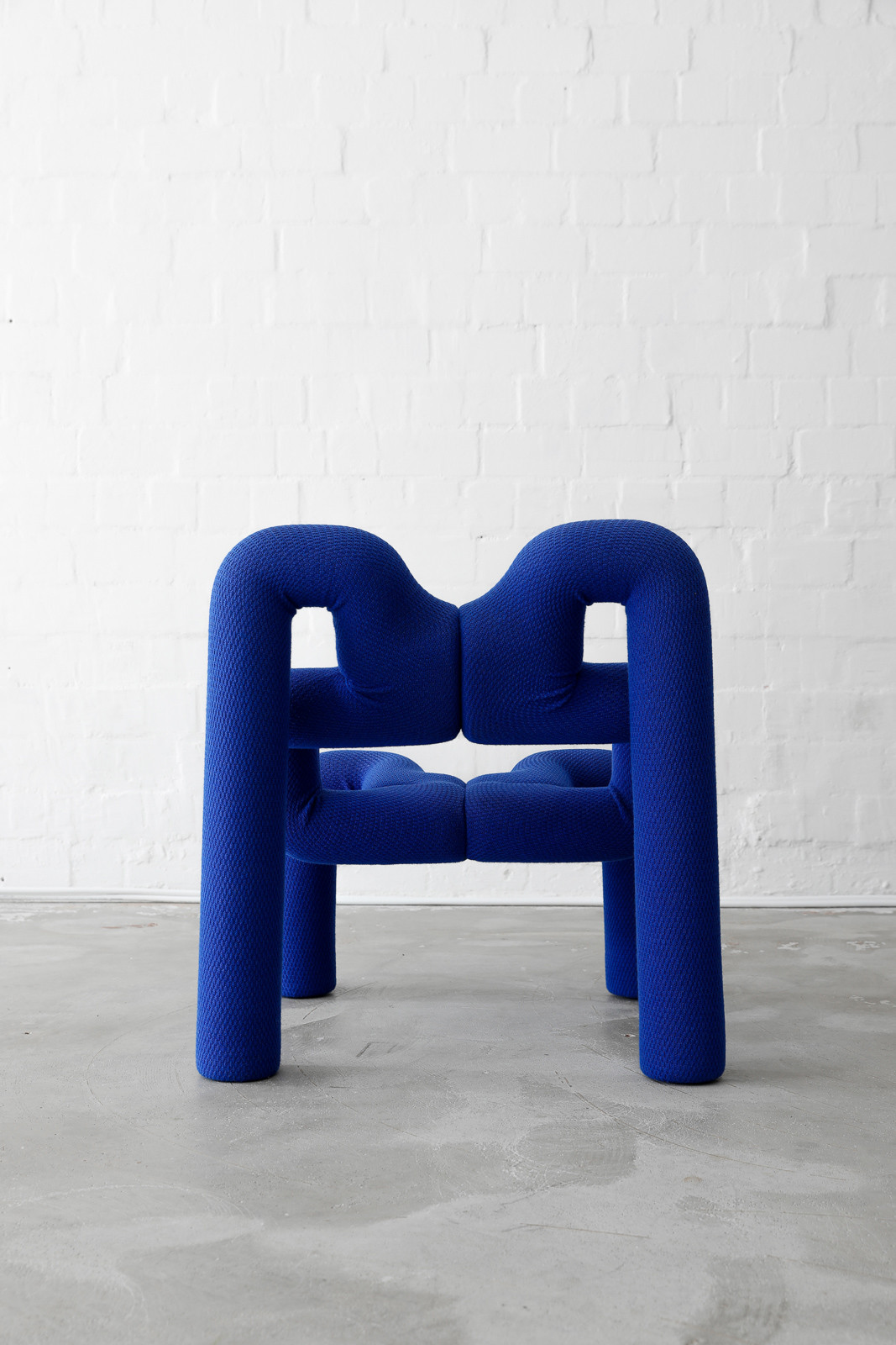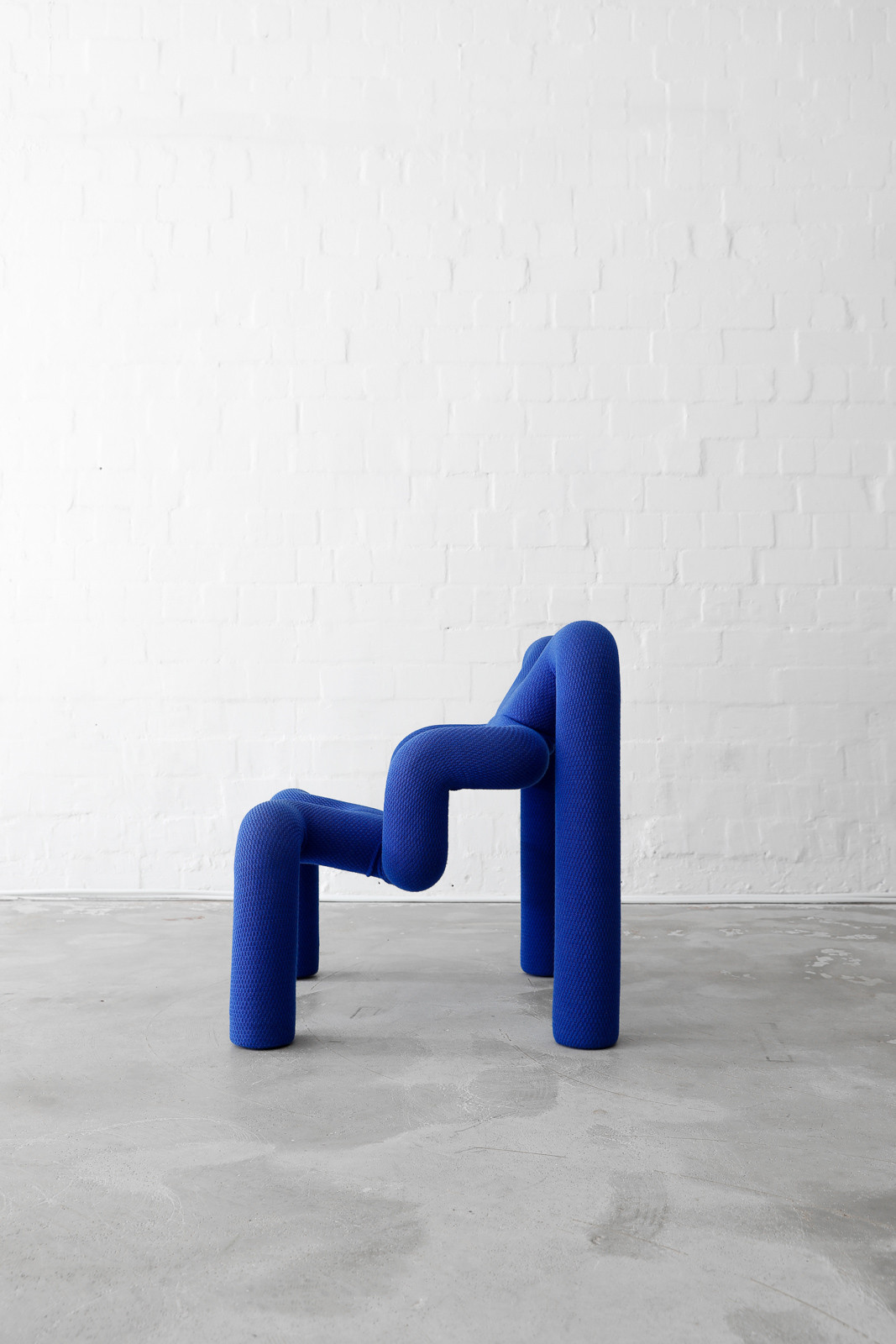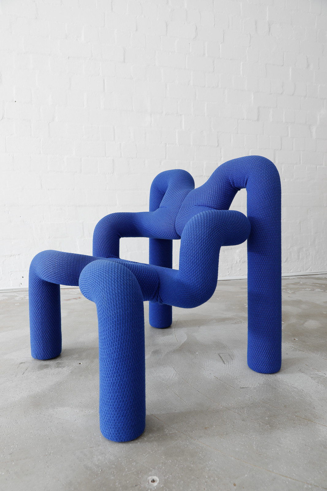 The Ekstrem by Terje Ekstrøm is a sculptural chair with a unique, asymmetrical shape, designed in the 1970s. Its ergonomic design provides versatile seating options, blending artistry with functionality. Beautiful blue knit fabric, in great condition.