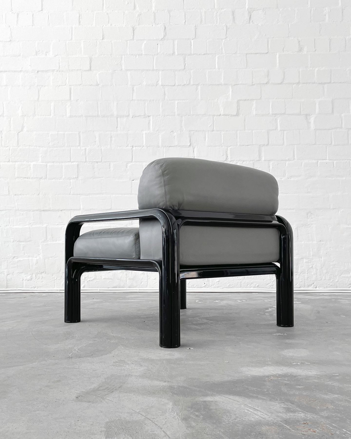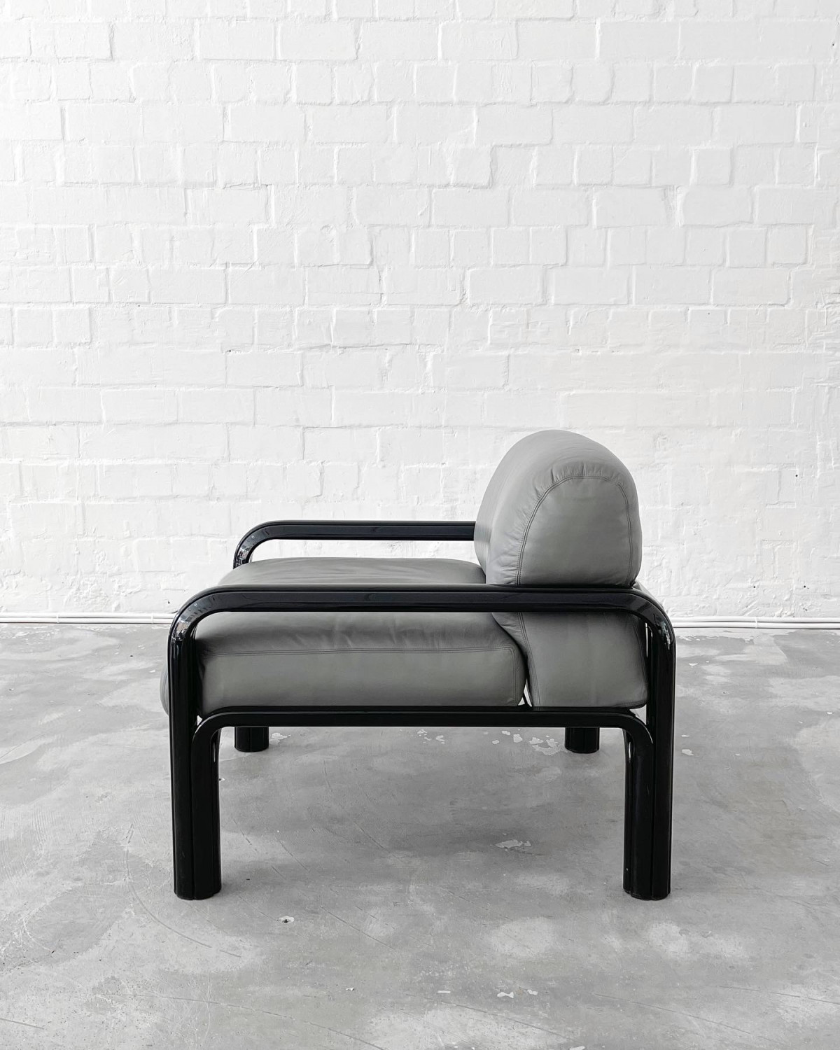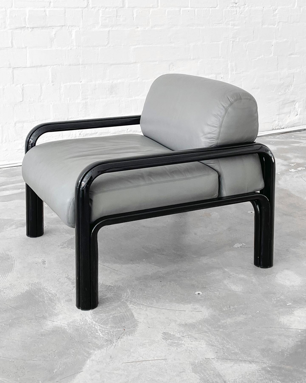 Iconic 54-S1 lounge chairs and two seater by Gae Aulenti for Knoll International, 1976. Black aluminium frame and light grey leather upholstery.