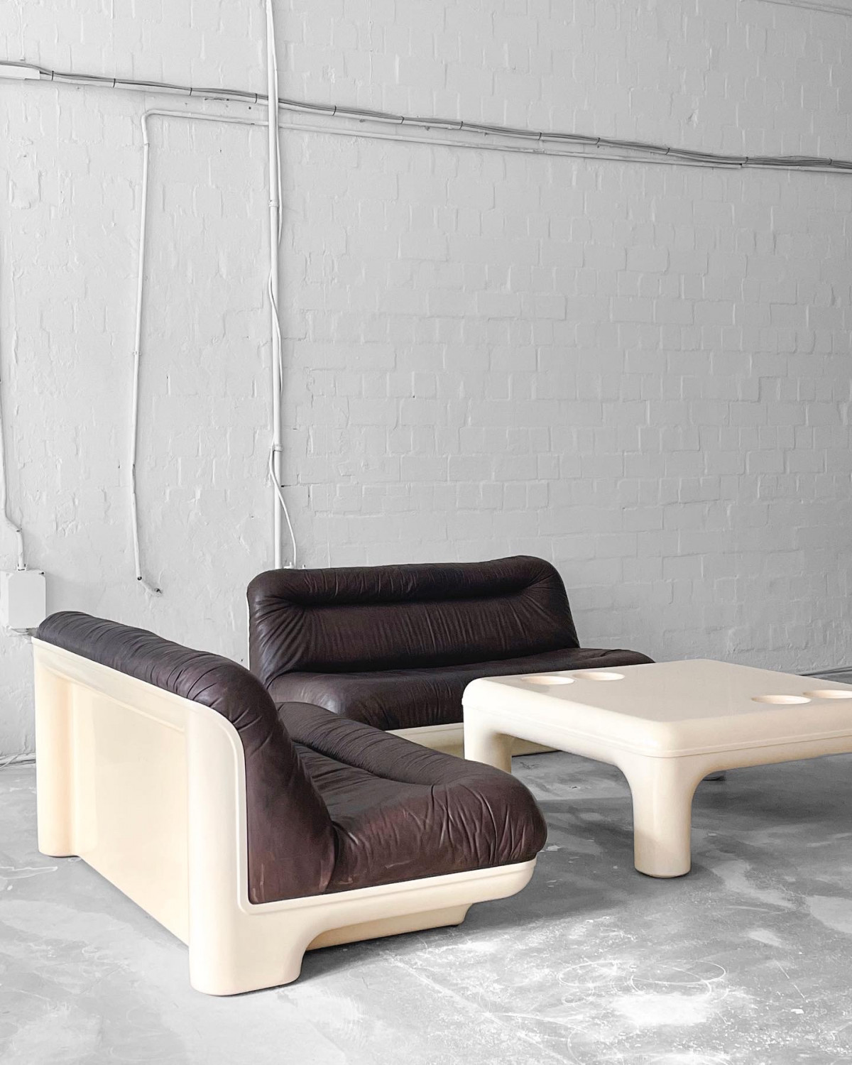This is a very unique and super rare sofa with matching coffee table, designed and produced from one of our favourite designers Gerd Lange in the 70s. The sofa is made of thick brown buffalo leather in a beautiful glass fiber reinforced polyester shell. The matching coffee table is also produced of glass fiber reinforced polyester. In beautiful vintage condition.