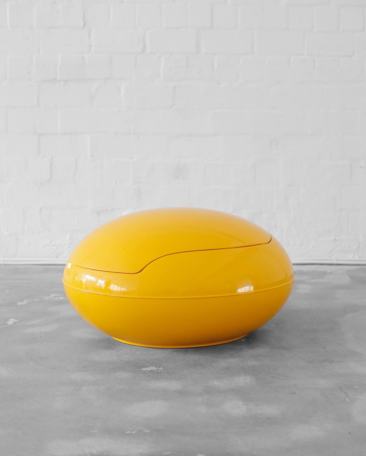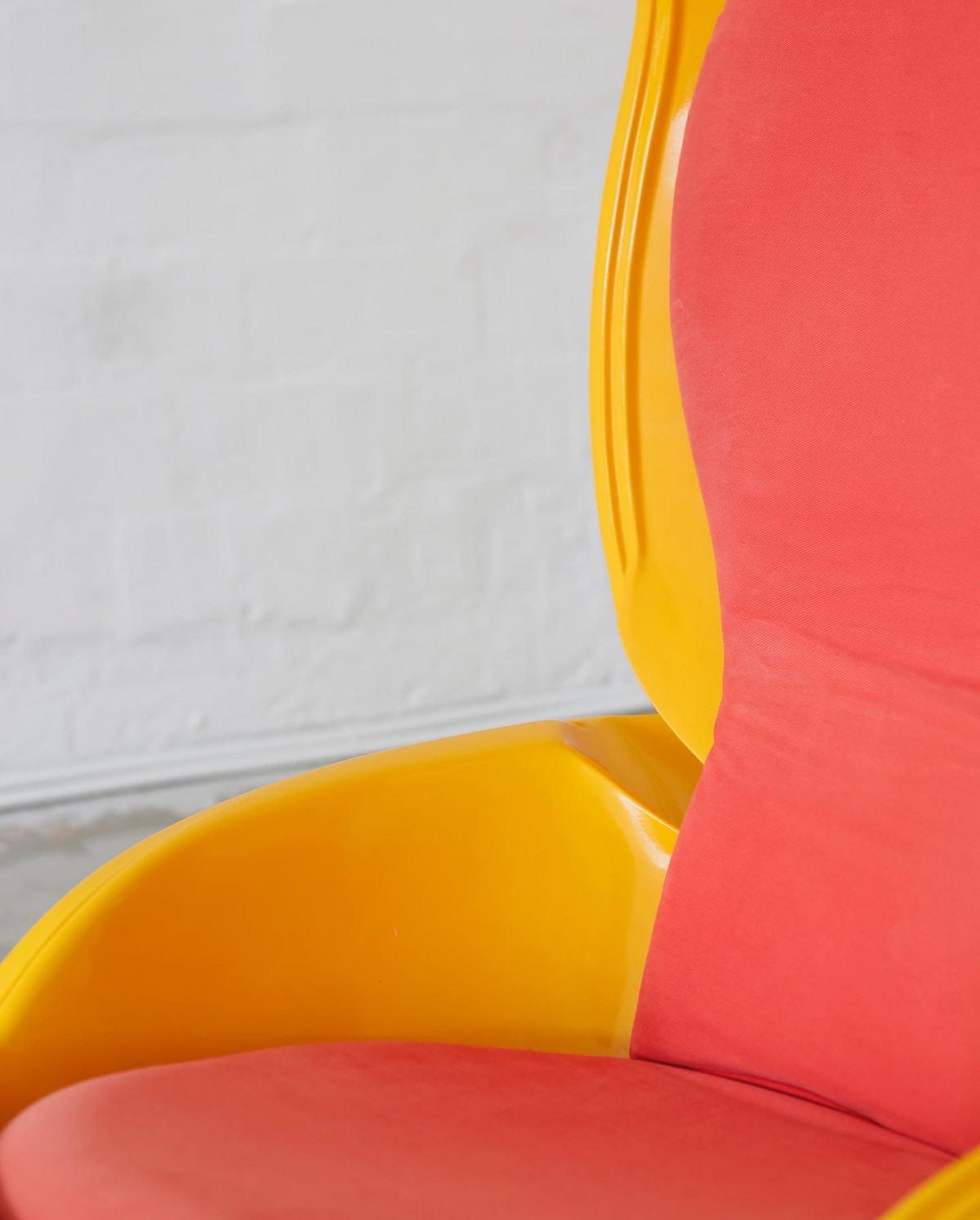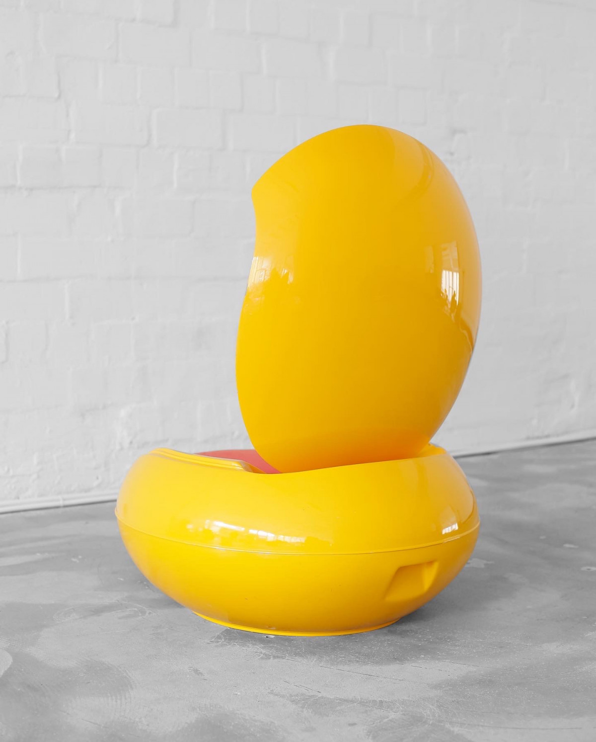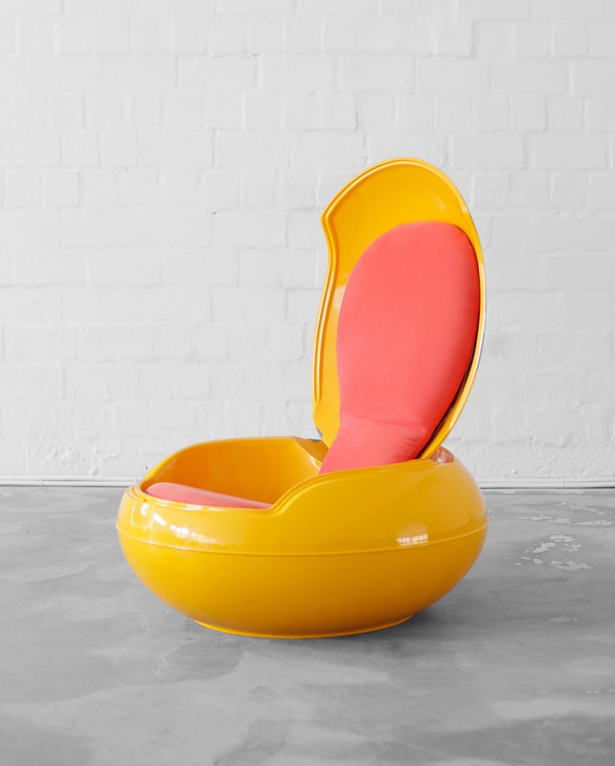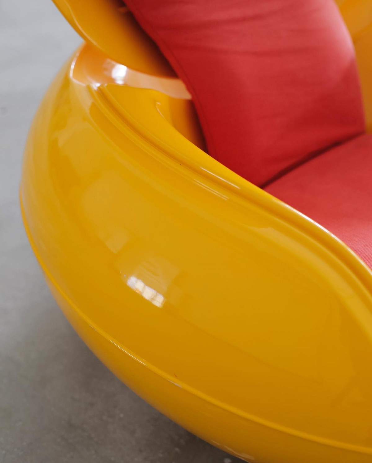 Icon of the sixties, the GN1 by Peter Ghyczy. Warm yellow fiberglass corpus and red fabric. This item is a reedition from 1998 for the IMM Cologne, with signed certification by the designer. For indoor and outdoor