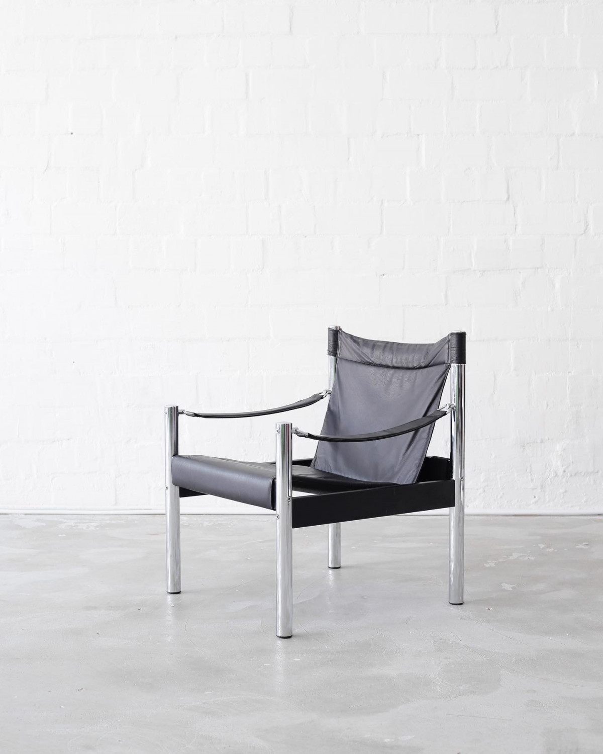 Safari arm chair by Börje Johanson for Johanson Design, Sweden 1970s. Chrome frame and thick leather, with fabric on the back side. In beautiful vintage condition.