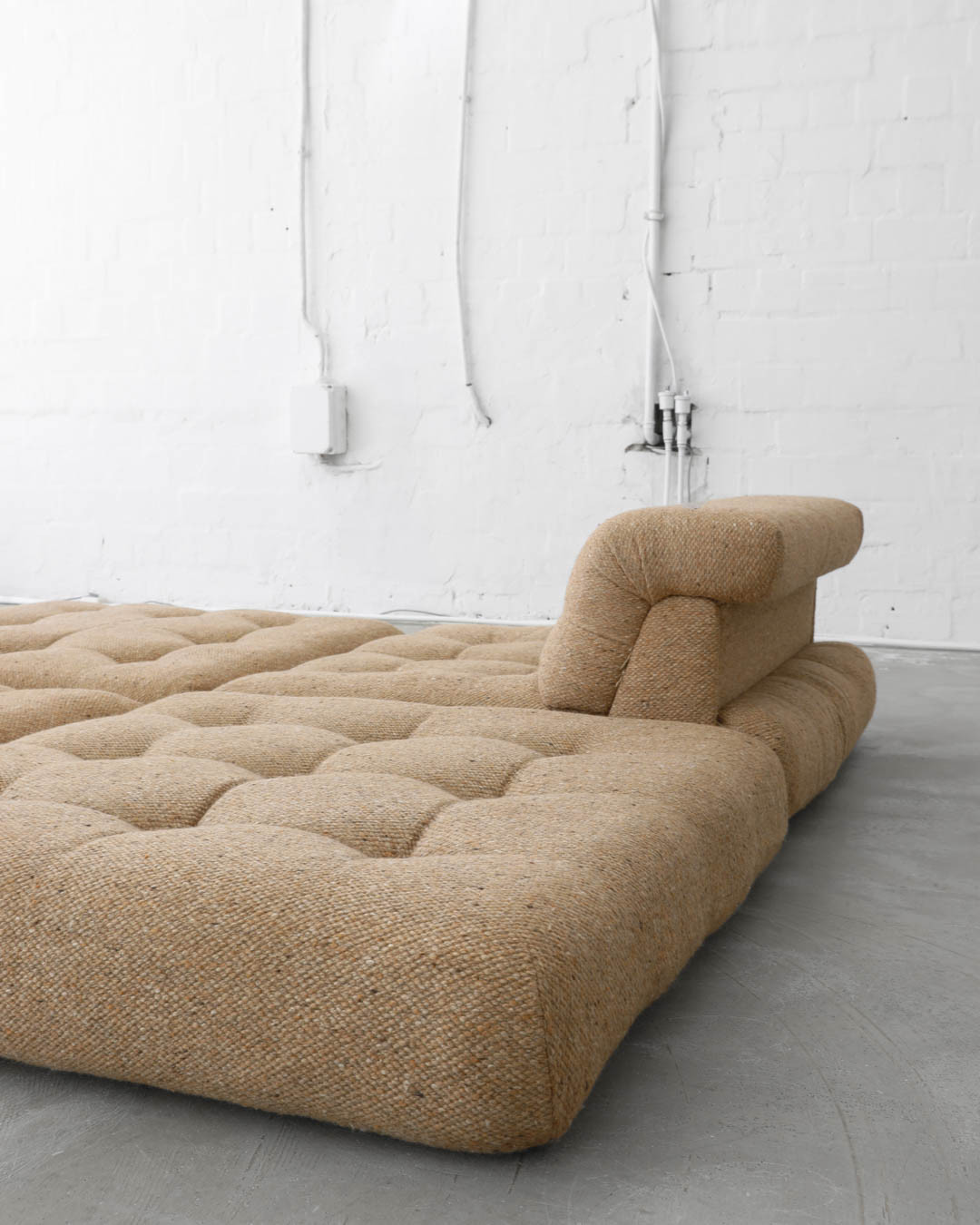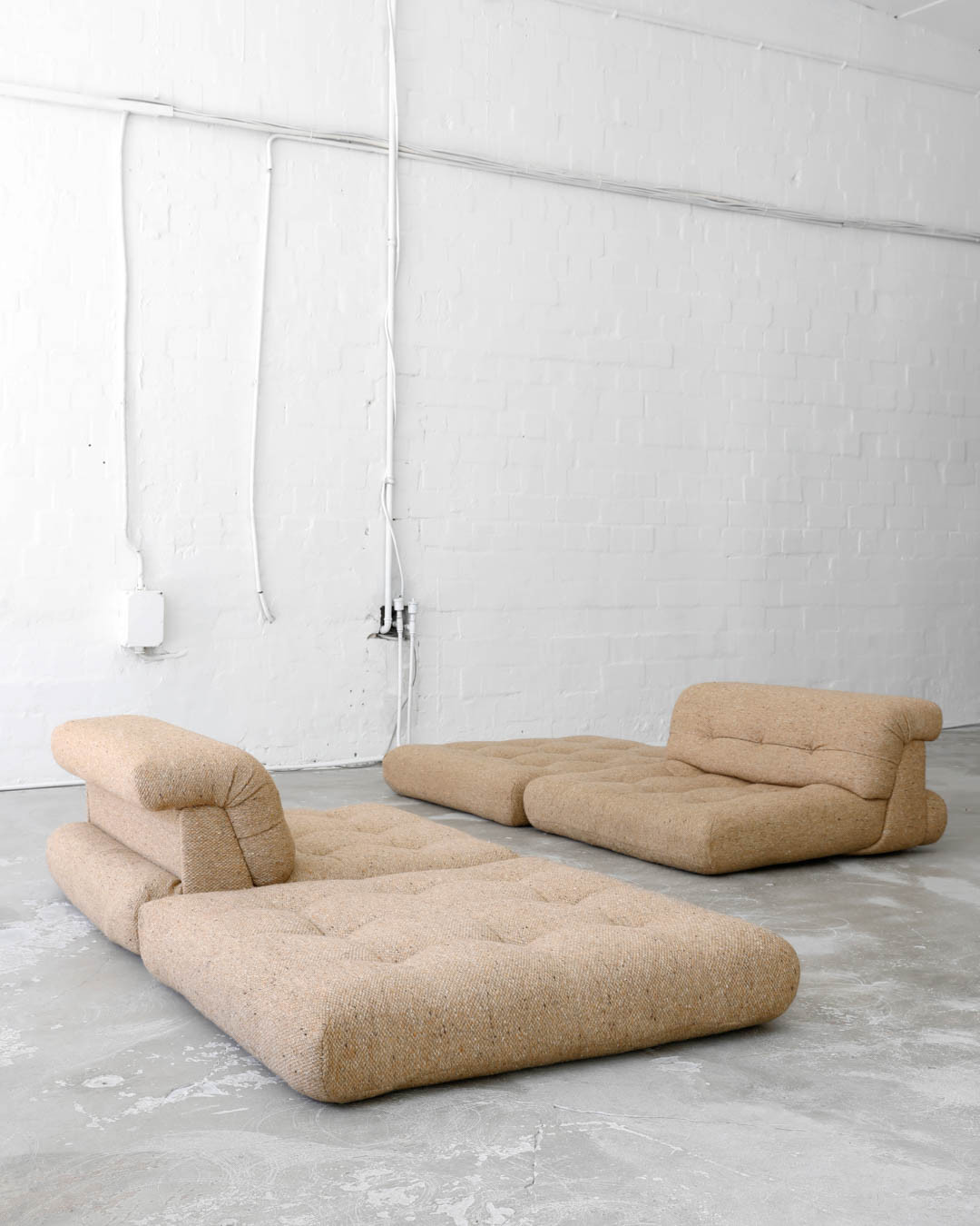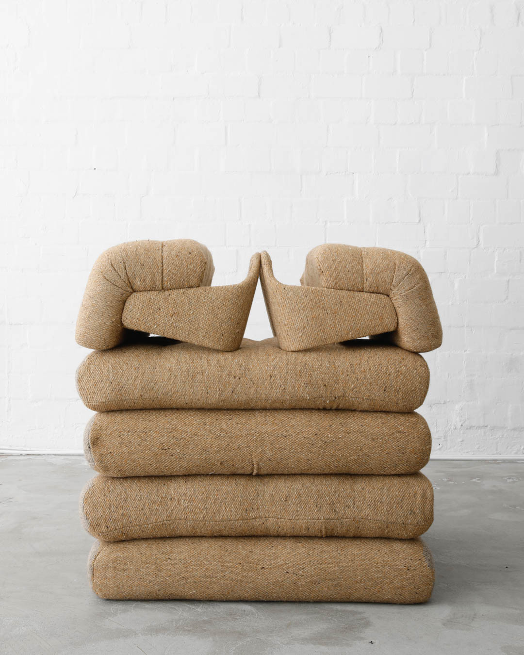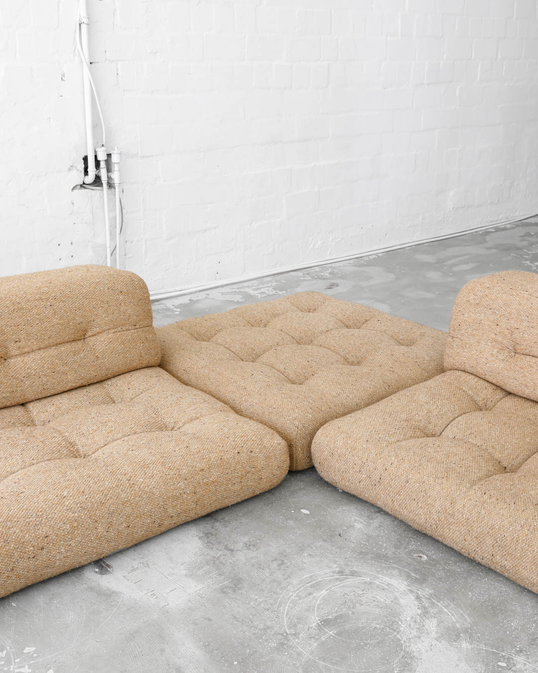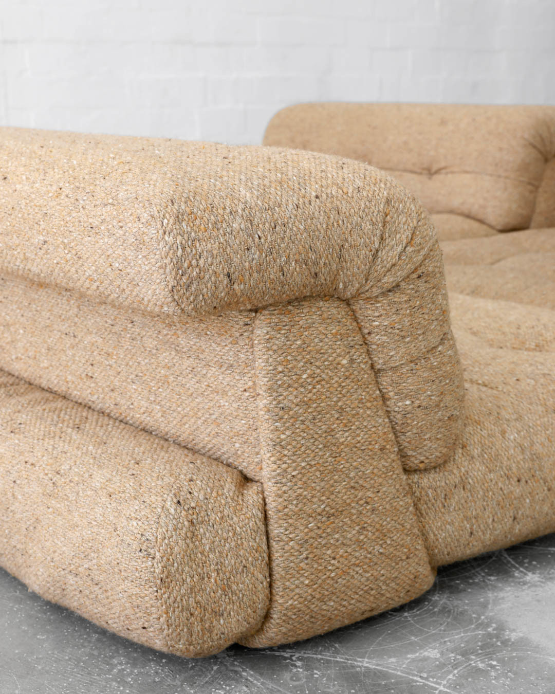 First Edition of the legendary modular Mah Jong sofa, designed in the 1970s by Hans Hopfer for Roche Bobois, France. A true gem, this piece offers a unique opportunity to create the perfect seating constellation for any space. Upholstered in thick wool fabric and in very nice vintage condition.