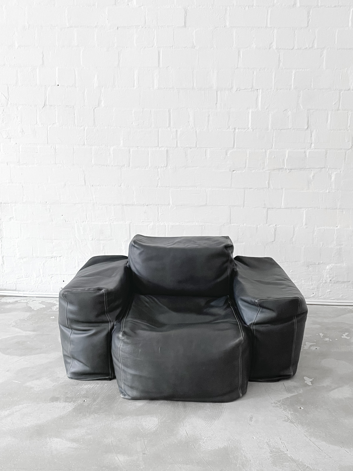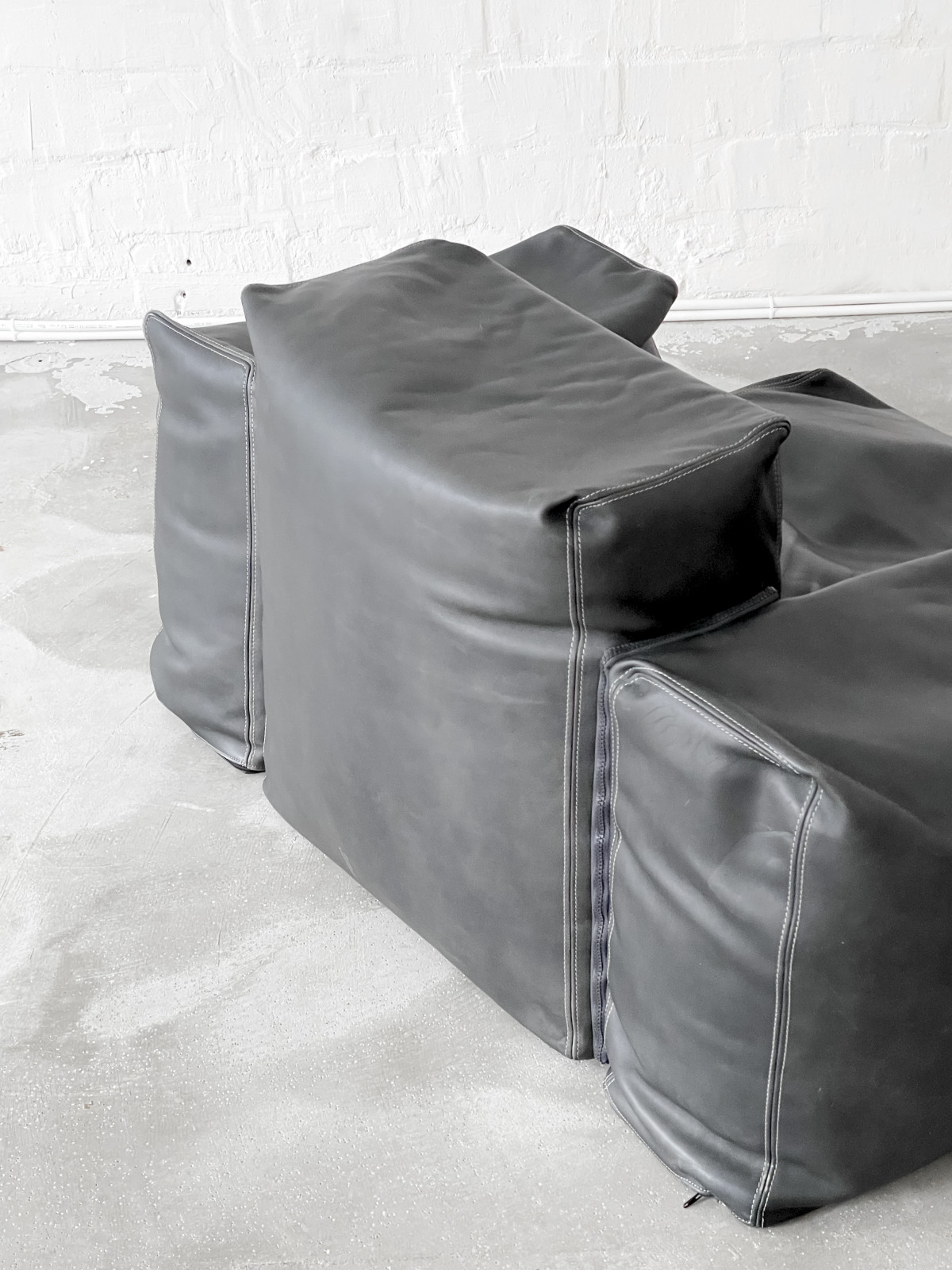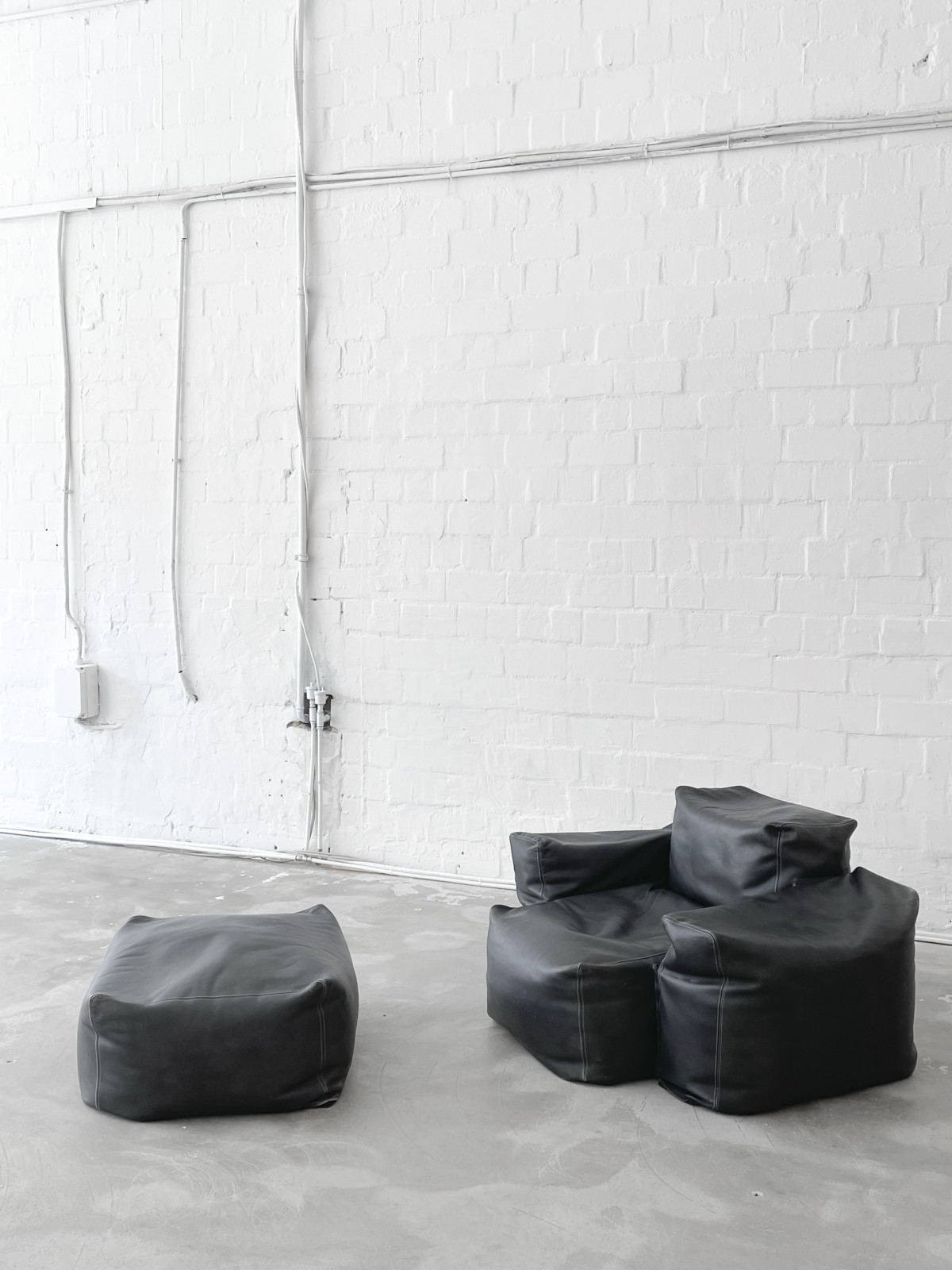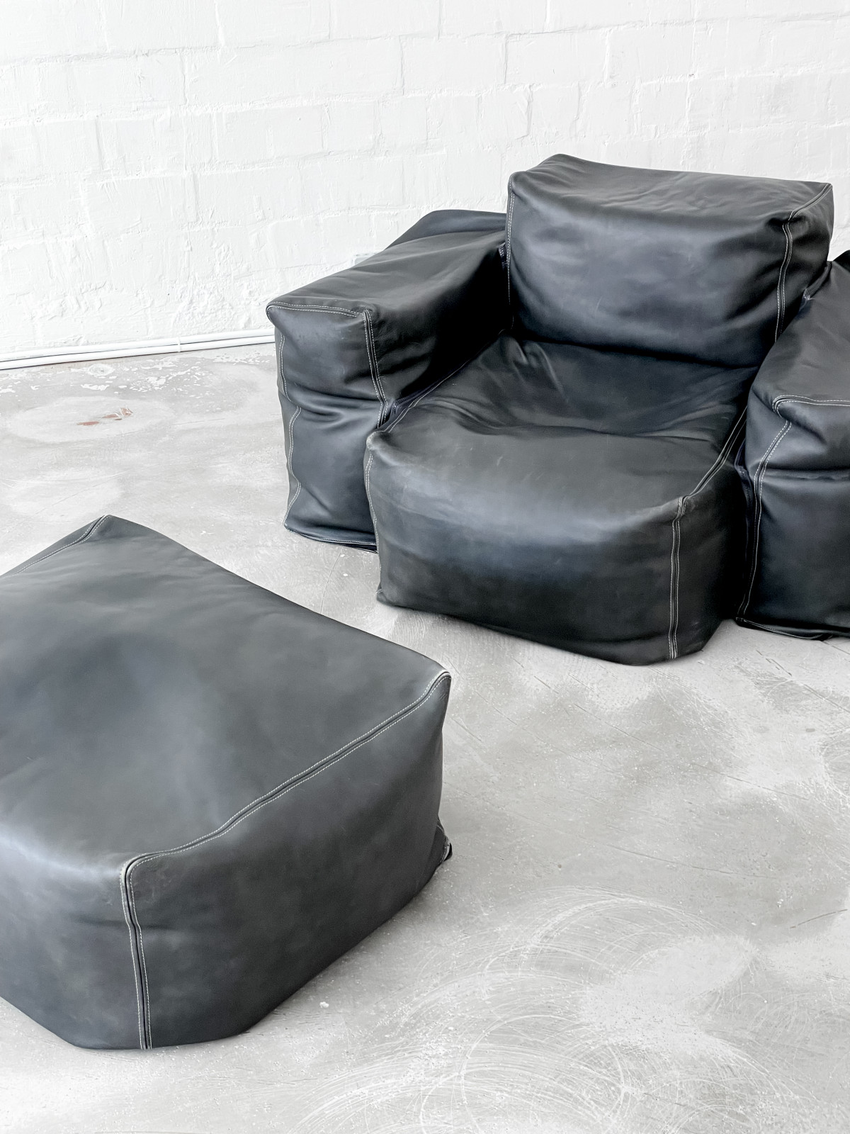 Oblong leather lounge chair with pouf. Designed in 2004 by Jasper Morrison for Cappellini, Italy. Connected by zips, holding seat, arm and back rest together. This comfy design is ready for a new place to move in.