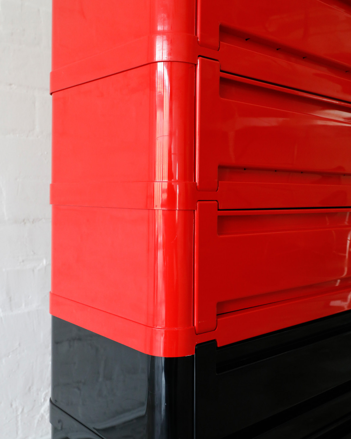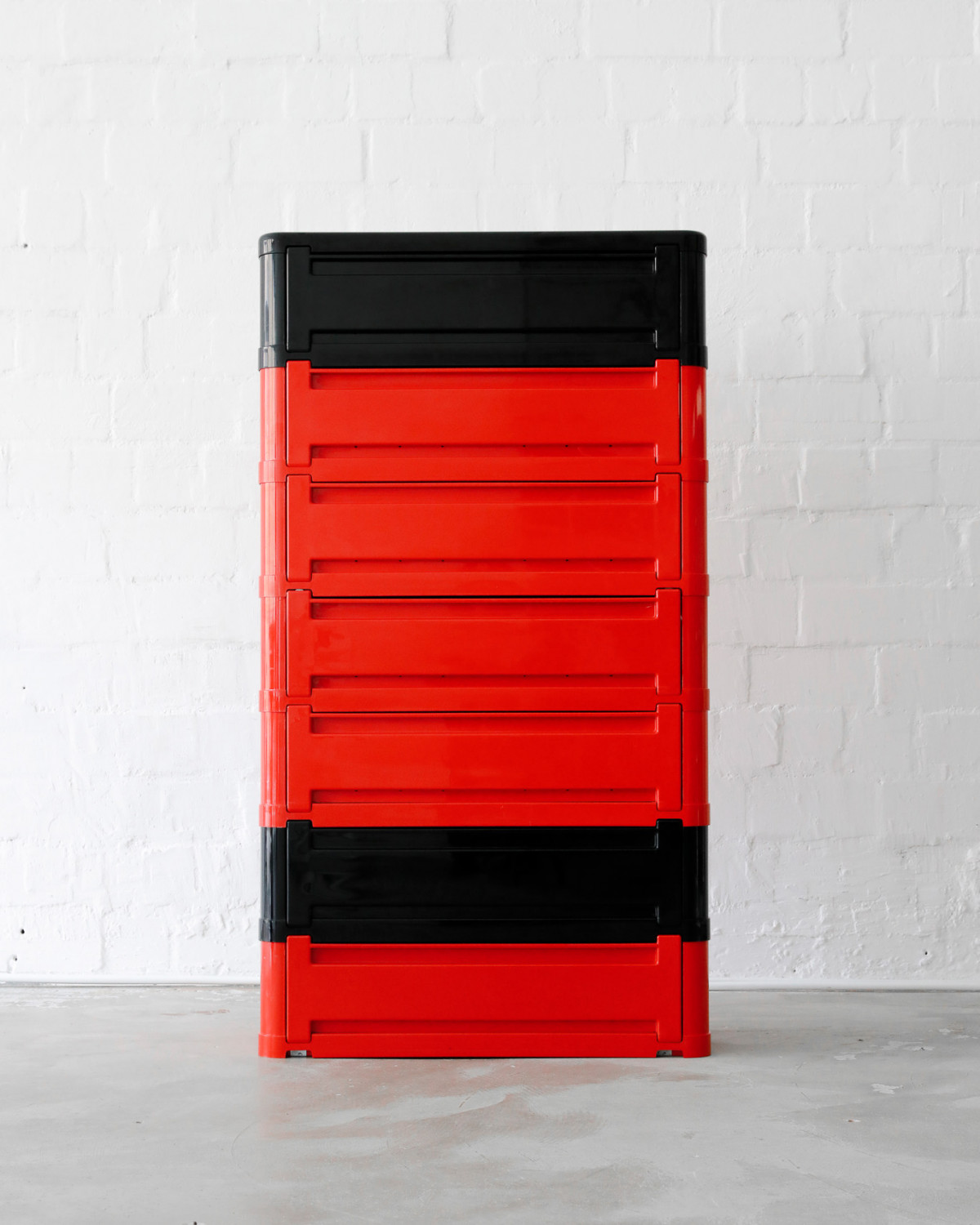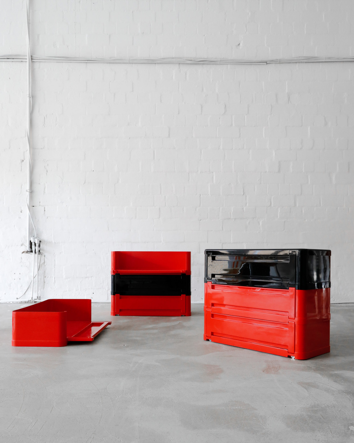 Designed by Olaf von Bohr and produced by Kartell in the 1970s, the modular chest of drawers, model ‘4964’, is a striking example of timeless design. Each of the seven glossy black and red modules features a rectangular base with rounded corners and a drawer that opens with a sleek flap.