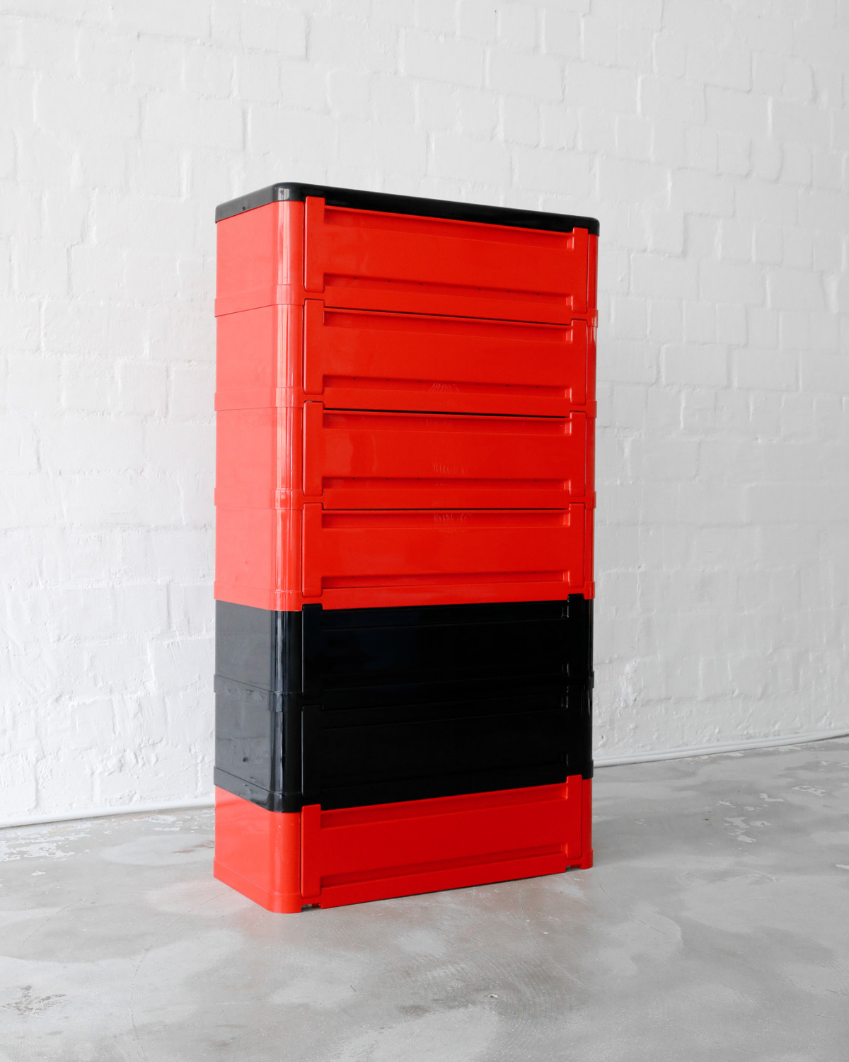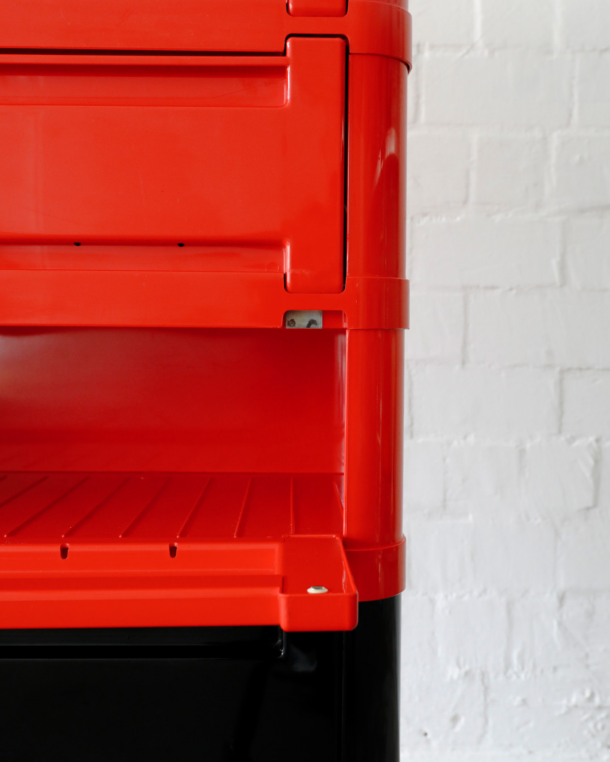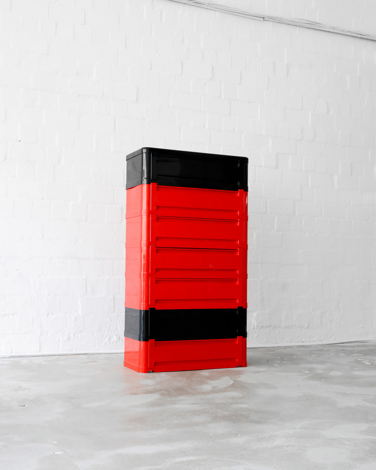 Designed by Olaf von Bohr and produced by Kartell in the 1970s, the modular chest of drawers, model ‘4964’, is a striking example of timeless design. Each of the seven glossy black and red modules features a rectangular base with rounded corners and a drawer that opens with a sleek flap.