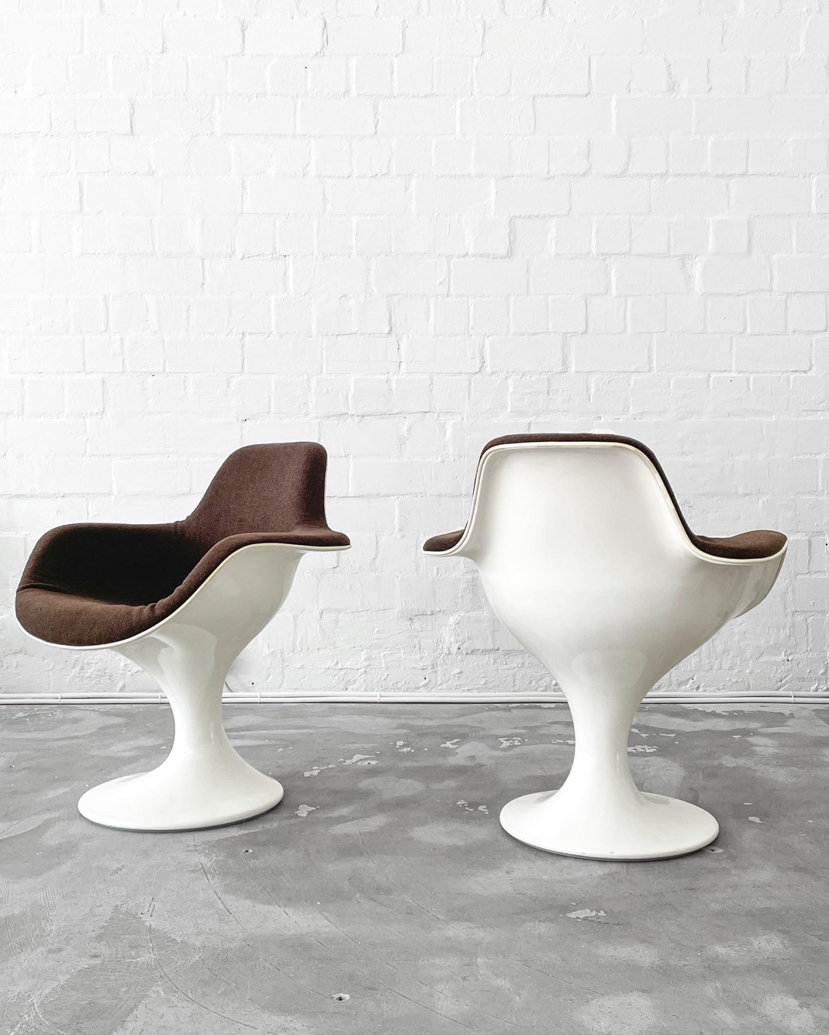 Legendary Orbit chairs, designed by Markus Farner & Walter Grunder in 1970 and produced by Herman Miller. White fiberglass with dark brown woolen fabric. In very good condition.