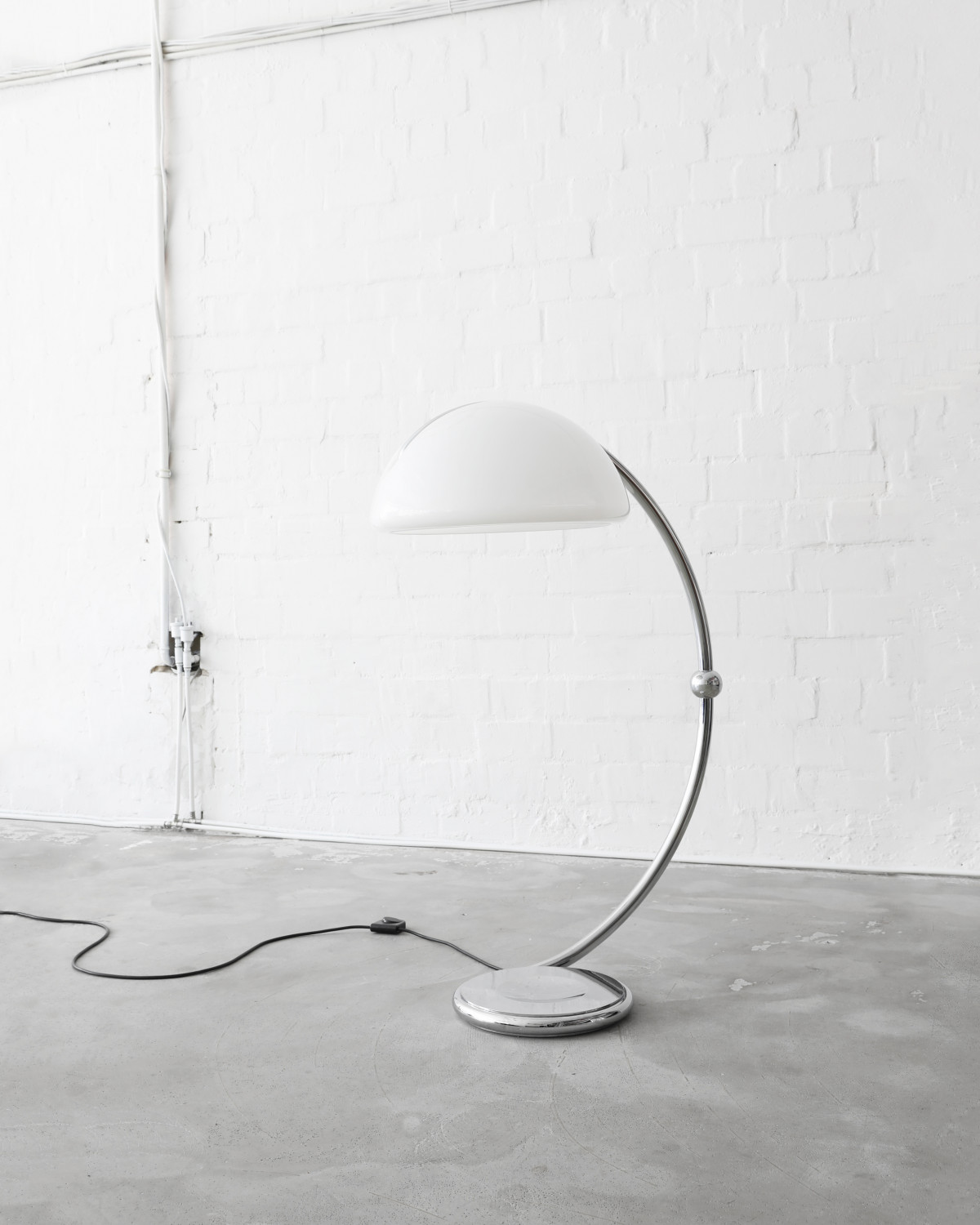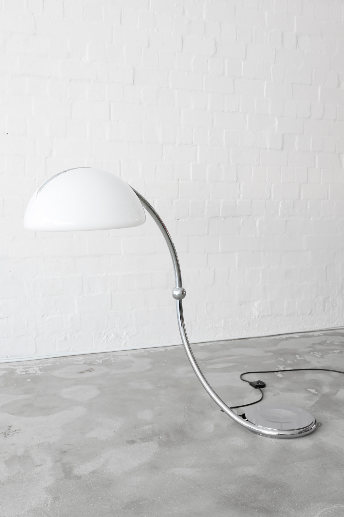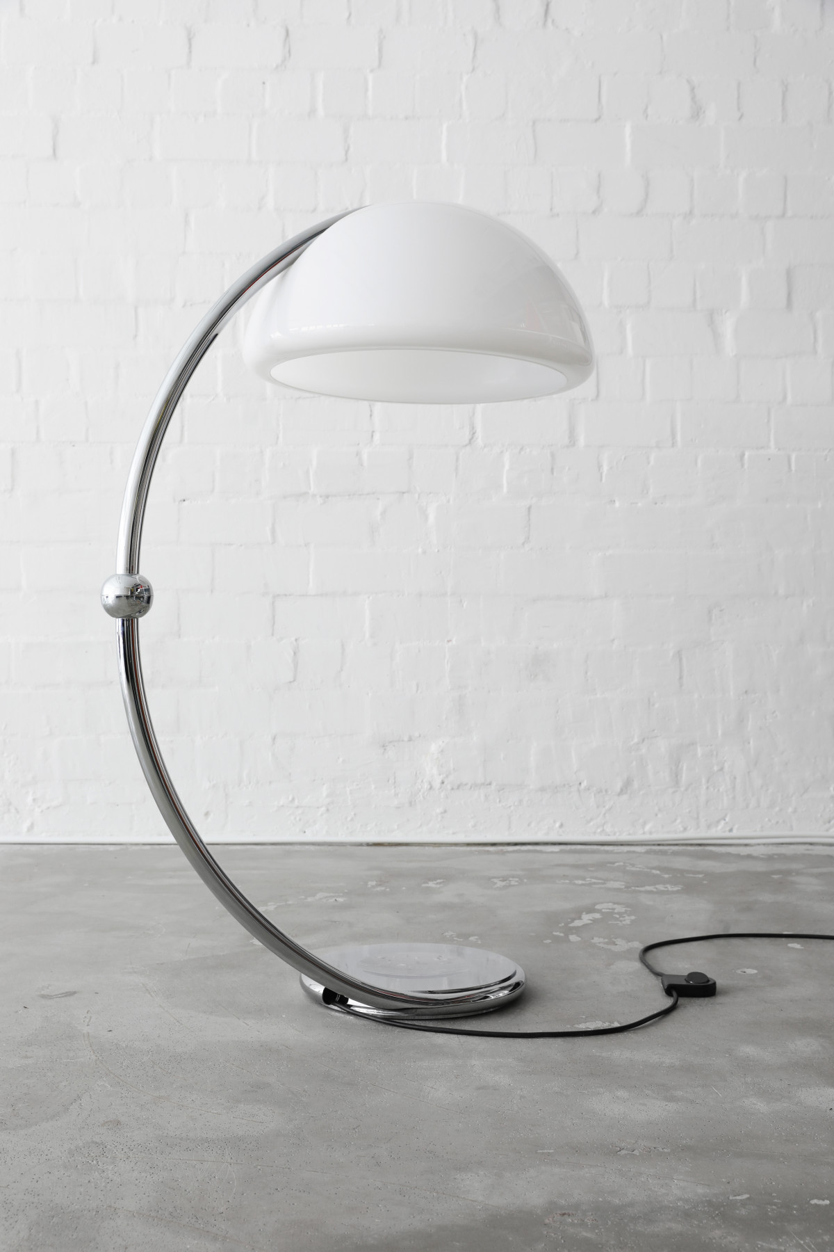 Freshly chromed Serpente floor lamp by Elio Martinelli for Martinelli Luce, Italy 1965. The chromed model was the first edition of the Serpente series. We really adore this design and the possibility to turn the lamp 360°.