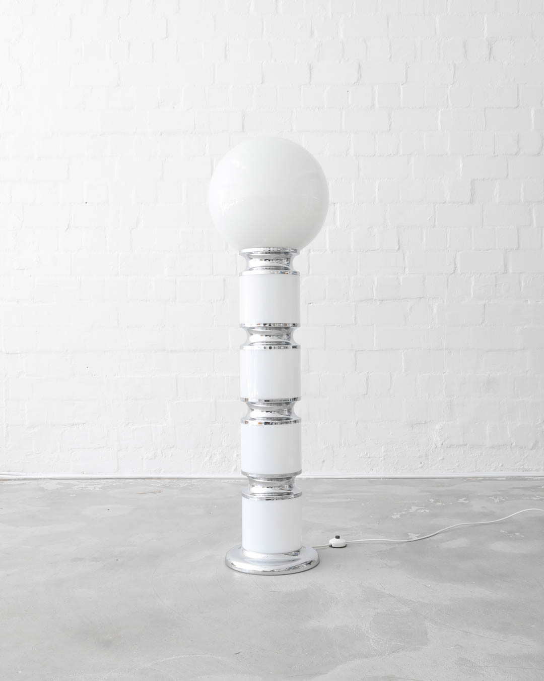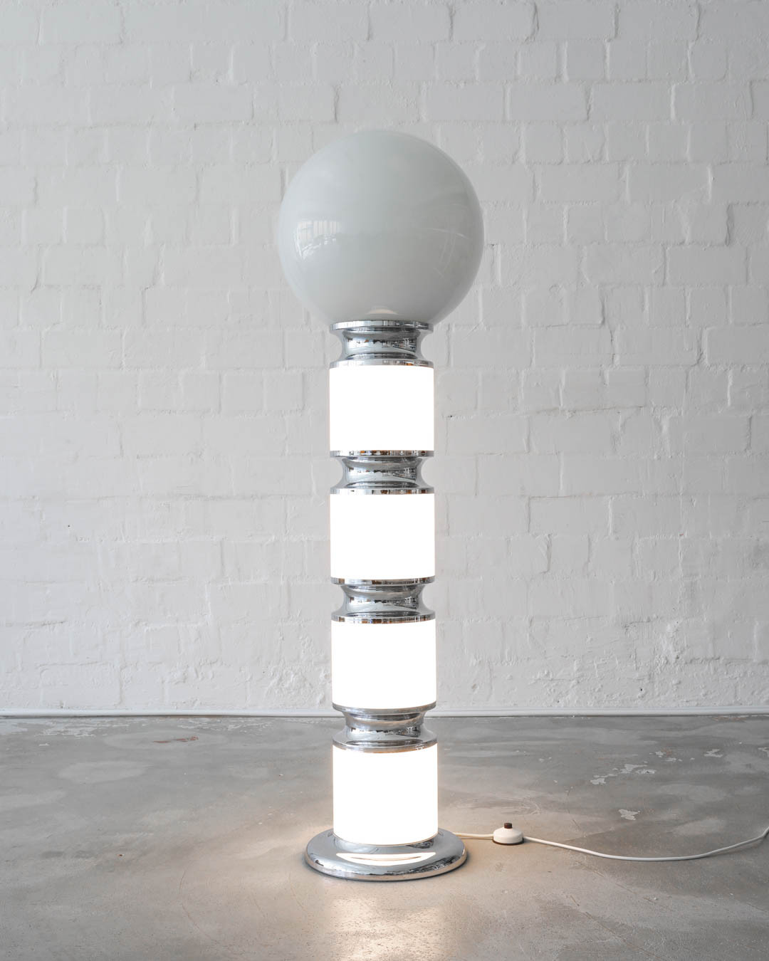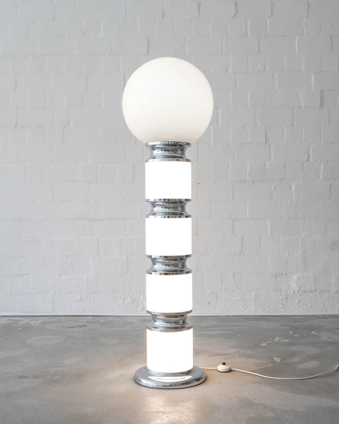 Space Age lamp featuring a large glass globe combined with chrome and acrylic elements. The lamp offers three lighting modes, allowing the globe and body to be illuminated separately or together. A true eye-catcher with a bold design.