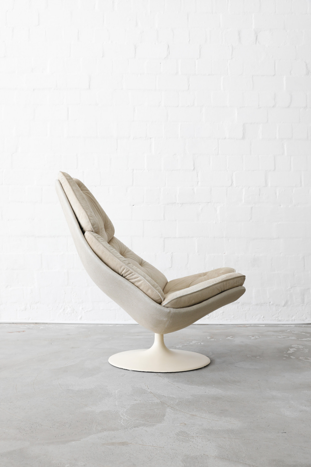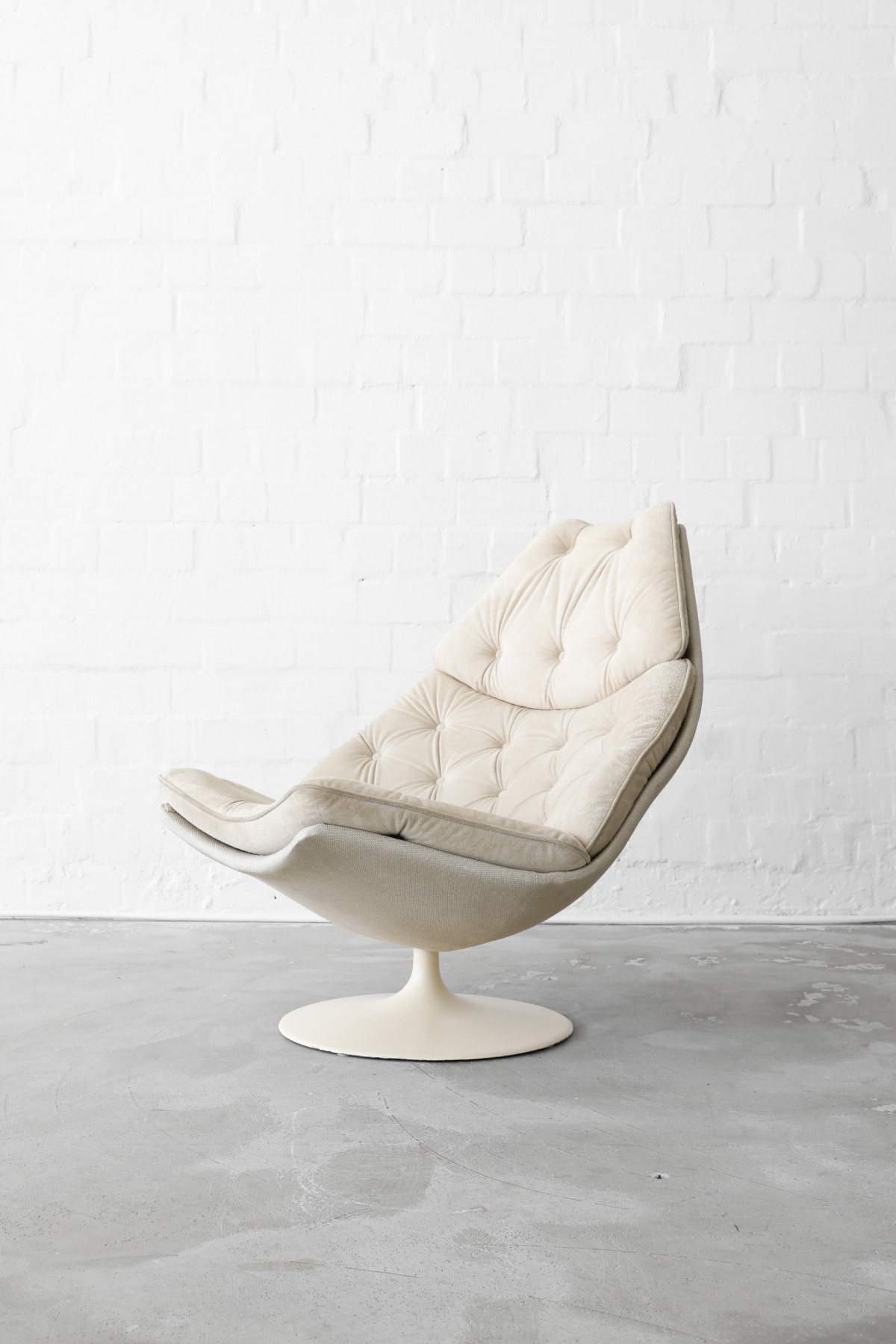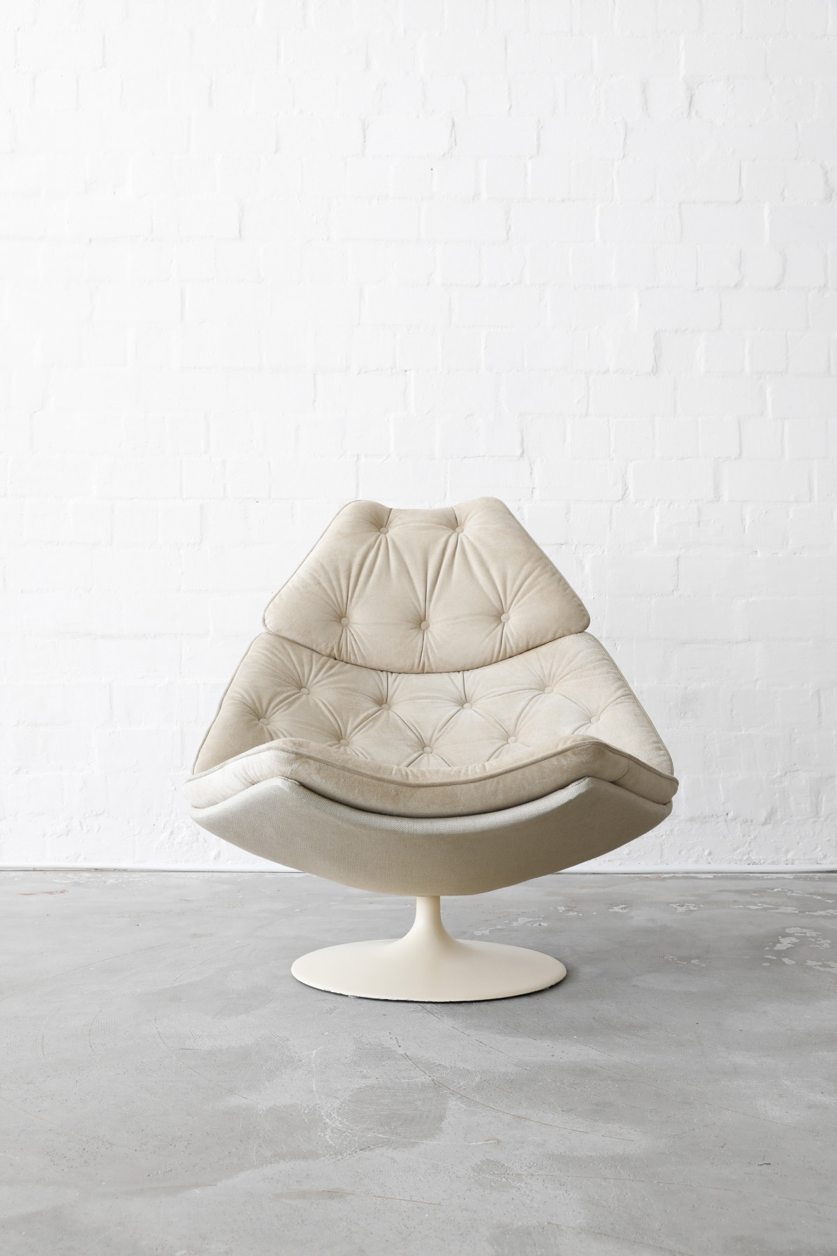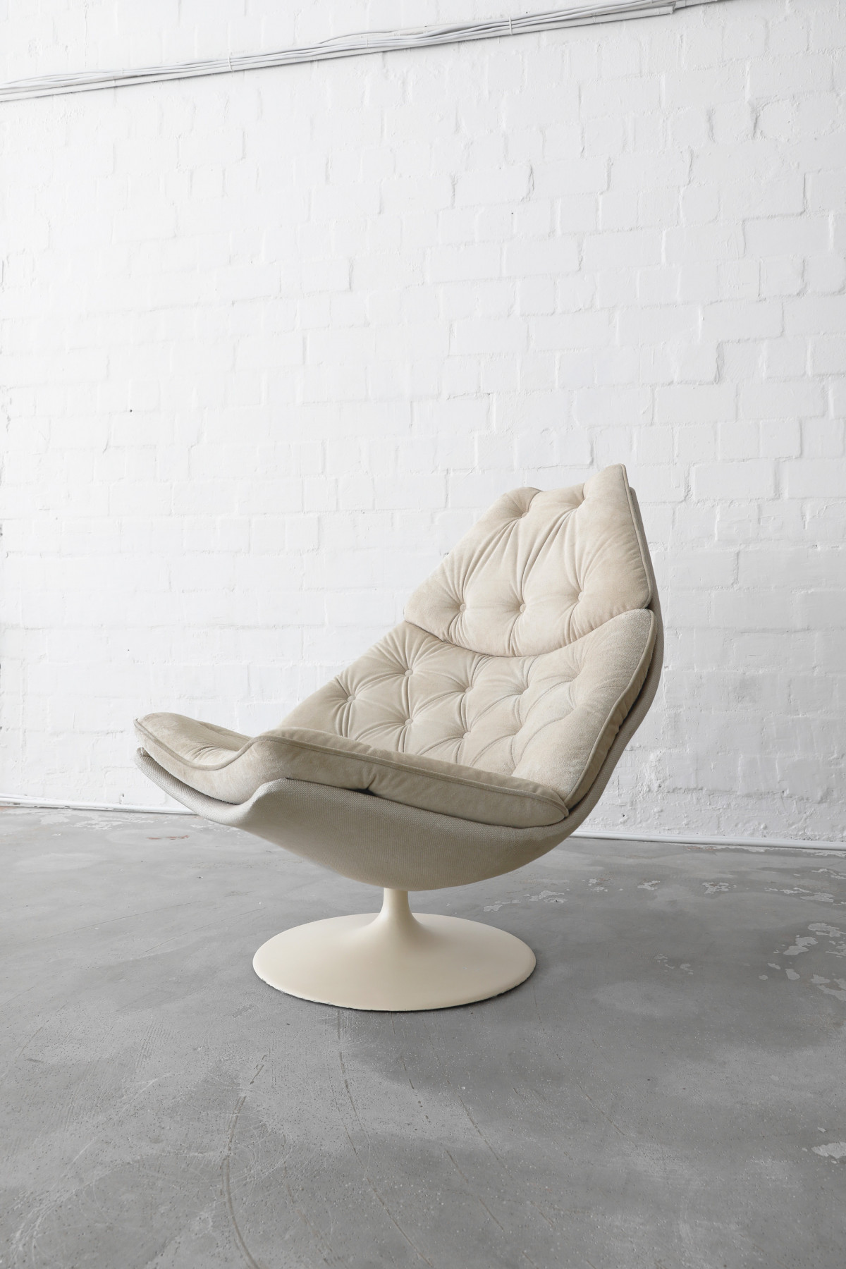 The Swivel Lounge Chair F588, designed by Geoffrey Harcourt for Artifort in the 1960s, embodies the essence of minimalist mid-century design, combining comfort with sculptural elegance. The chair features beige seat cushions crafted from wild hide, complemented by a shell upholstered in a beautiful thick fabric.