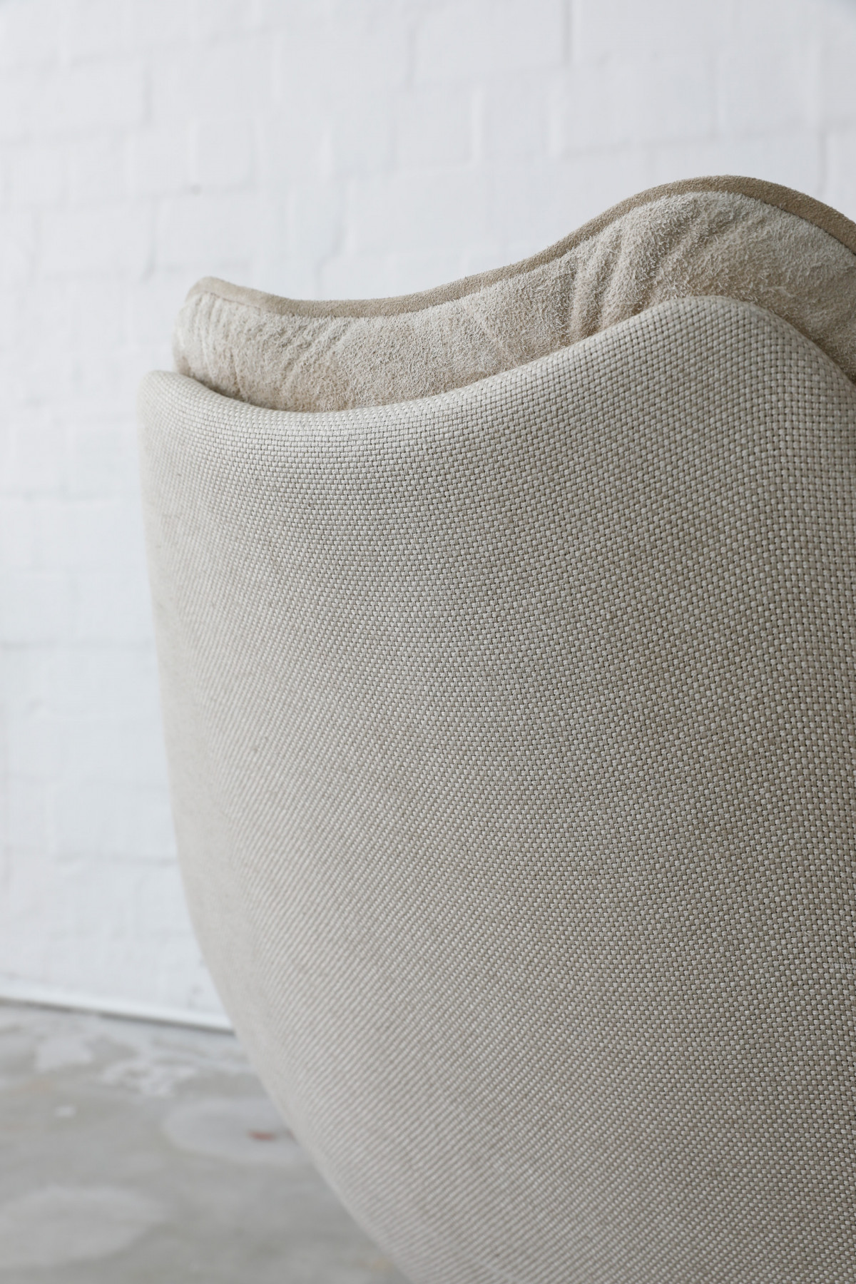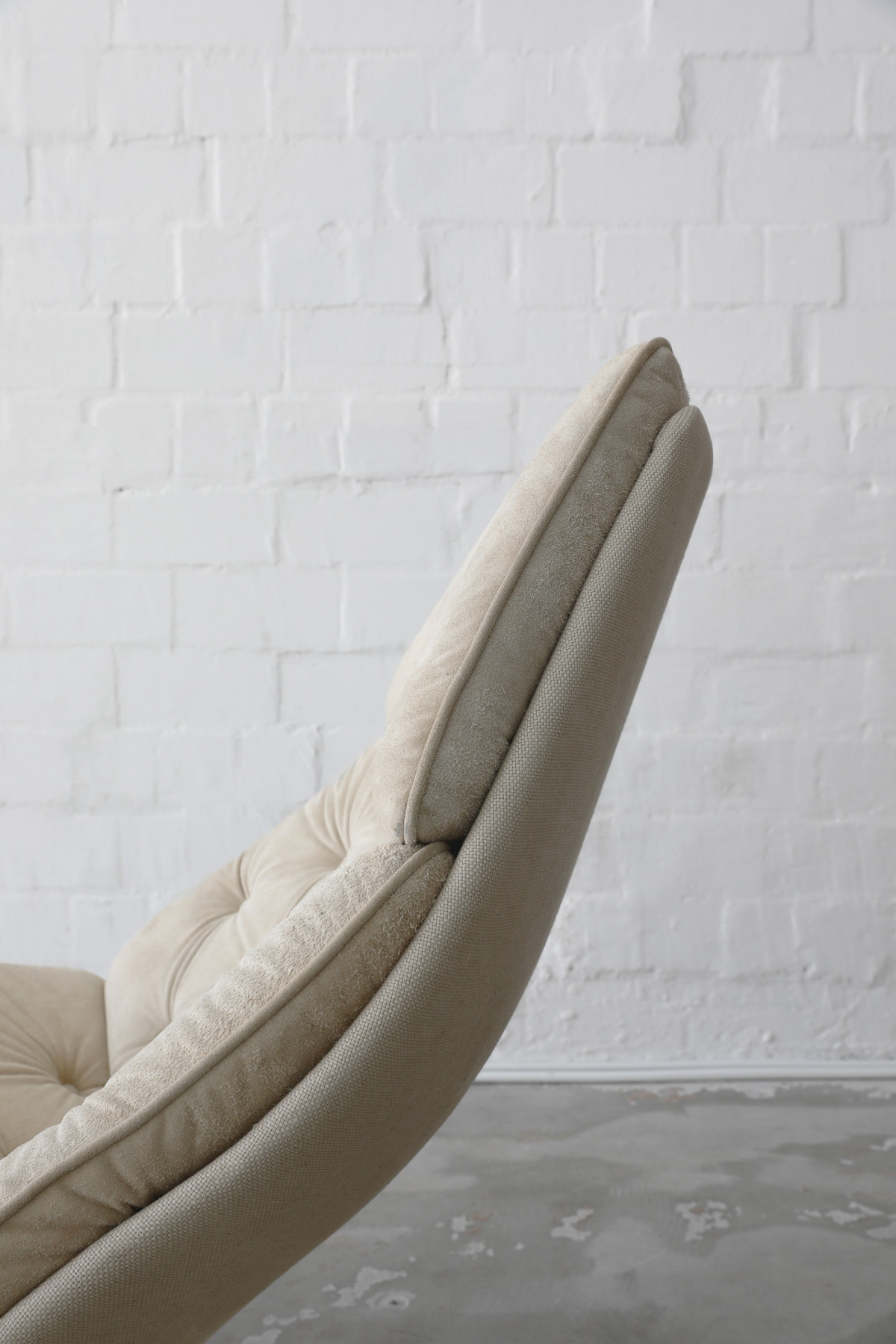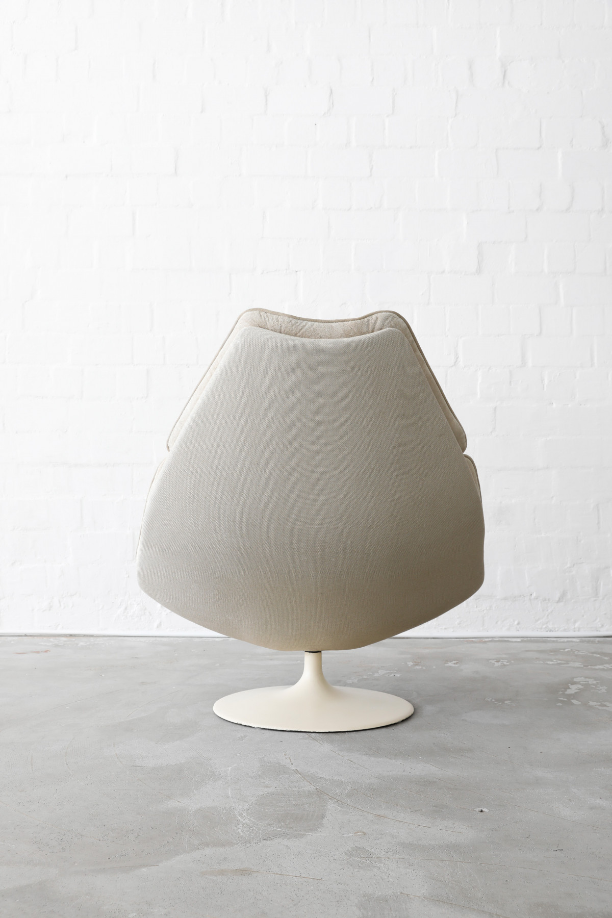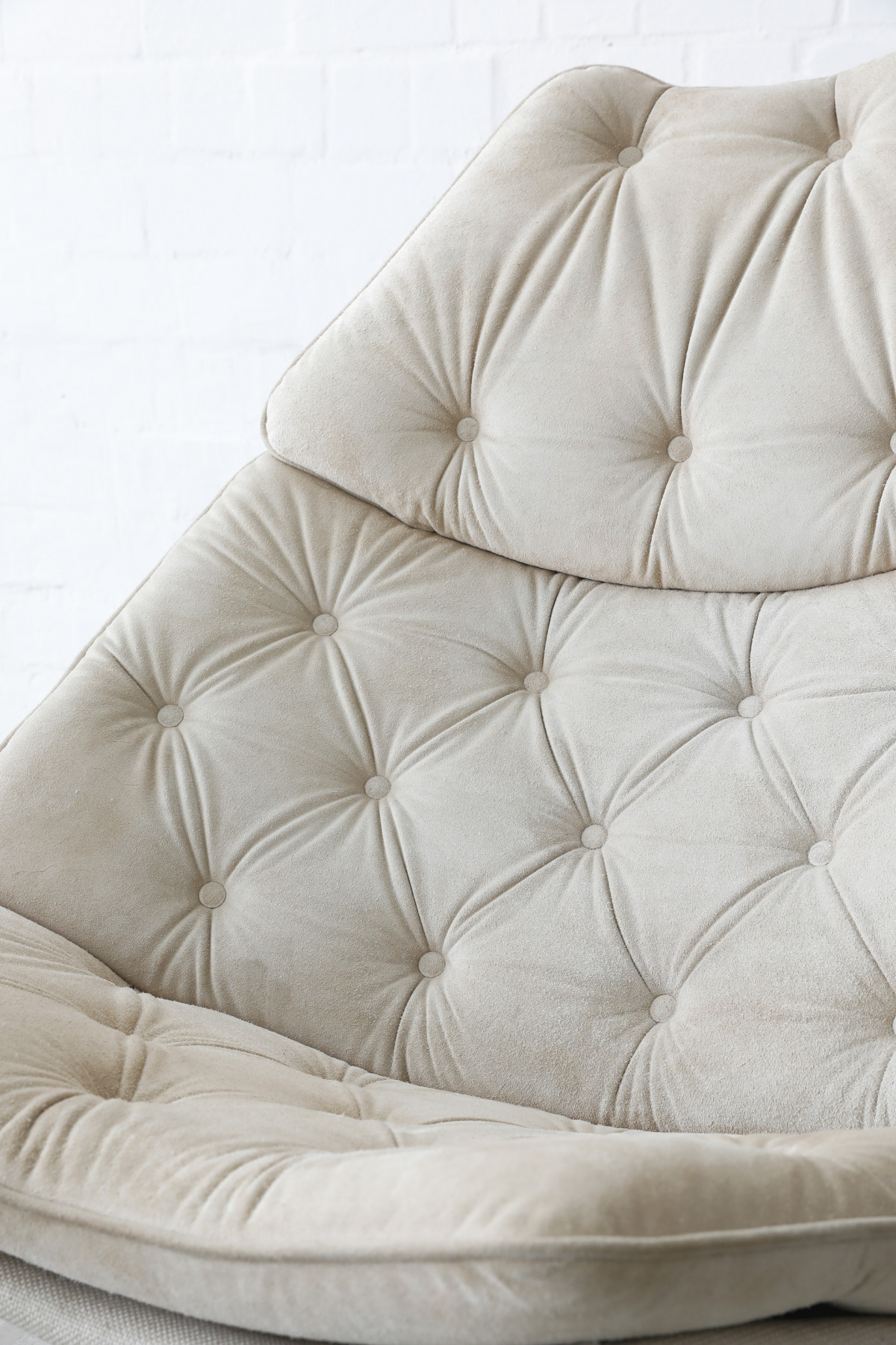 The Swivel Lounge Chair F588, designed by Geoffrey Harcourt for Artifort in the 1960s, embodies the essence of minimalist mid-century design, combining comfort with sculptural elegance. The chair features beige seat cushions crafted from wild hide, complemented by a shell upholstered in a beautiful thick fabric.
