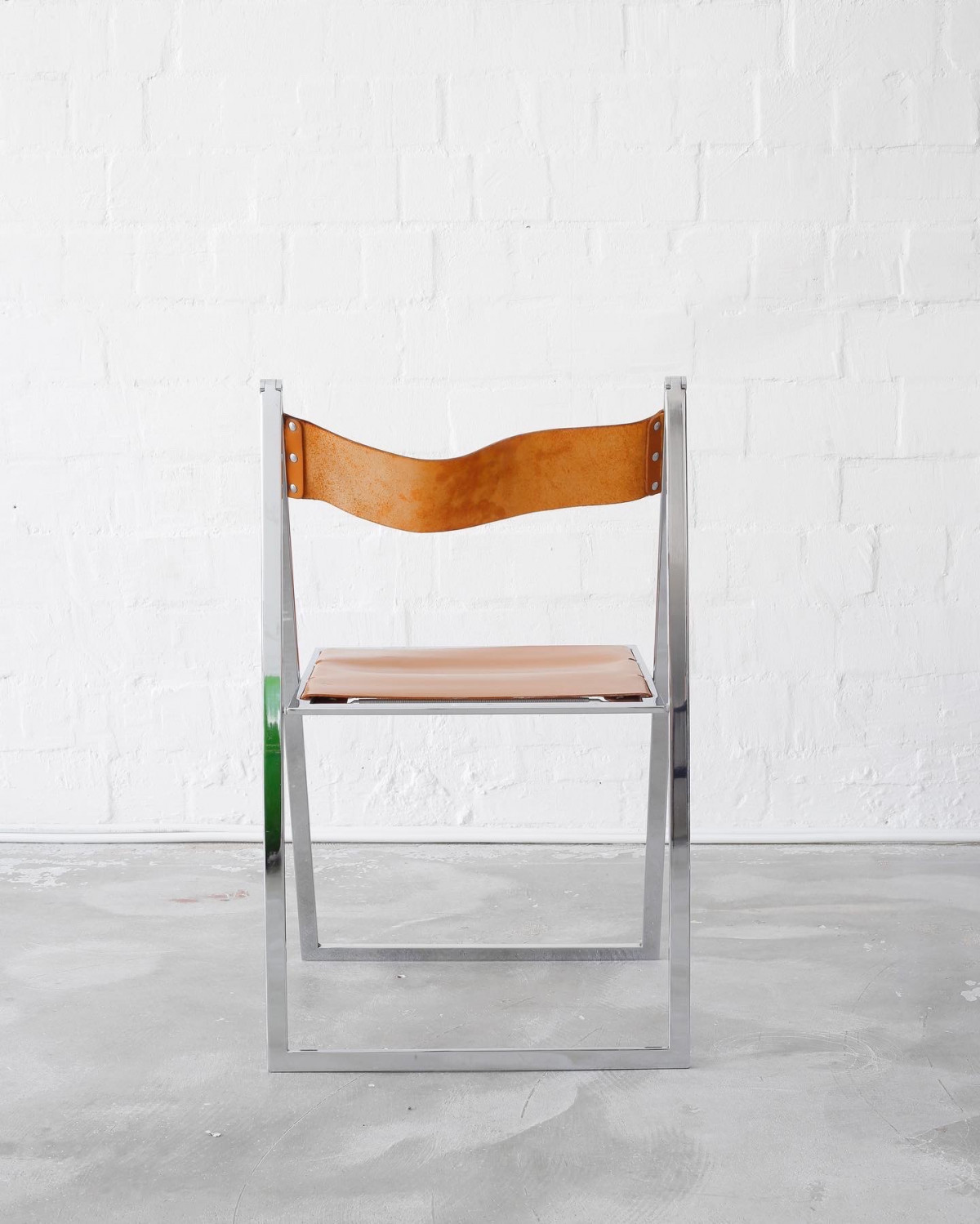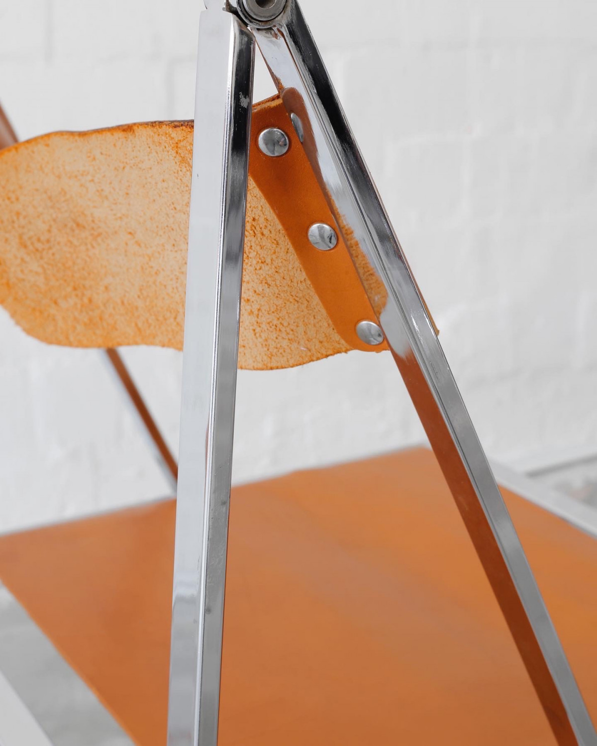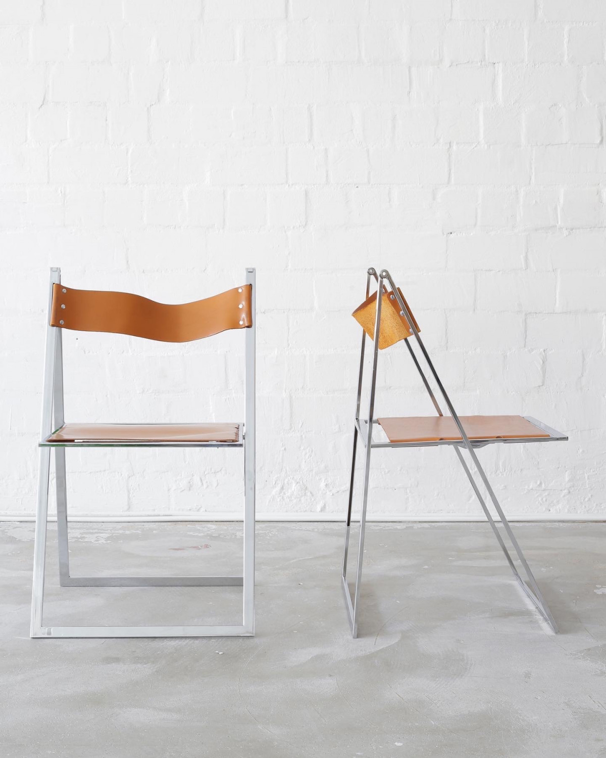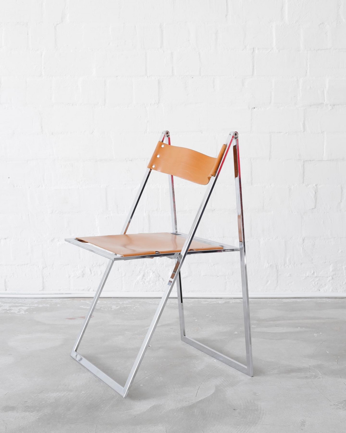 First edition of the beautiful Vono folding chair designed and produced by Lübke. Thick cognac brown leather and high quality chrome frame. It’s the thinnest folding chair ever.