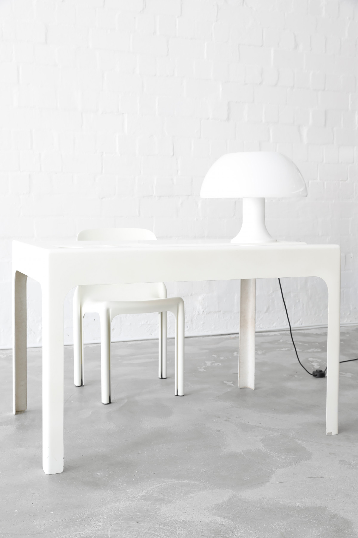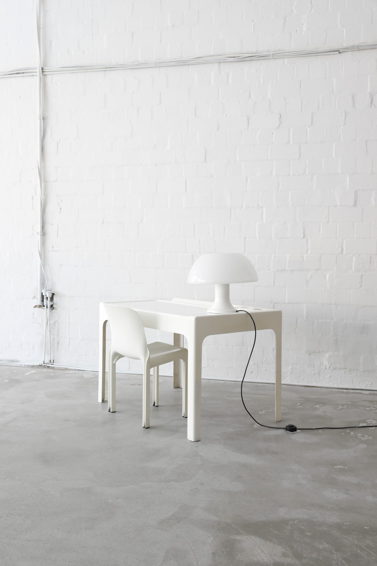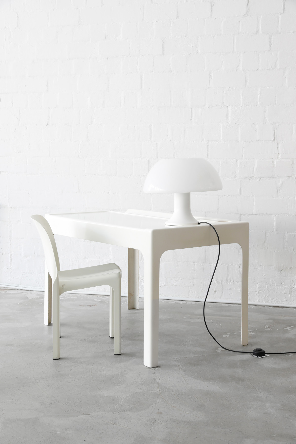 Rare Ozoo Space Age writing desk by Marc Berthier for D.A.N. Paris, 1960s. White fiberglass structure and cute little details for books and storing pens. Here in combination with the Artemide Selene Chair and this beautiful Martinelli Luce Lamp.