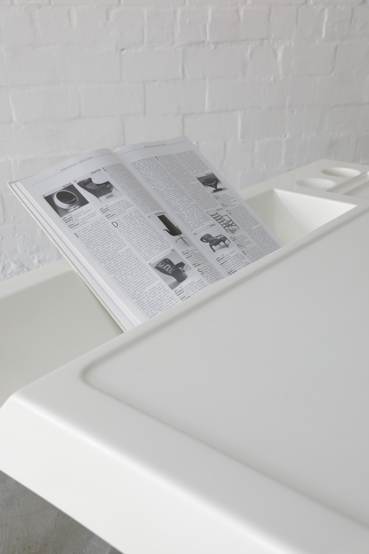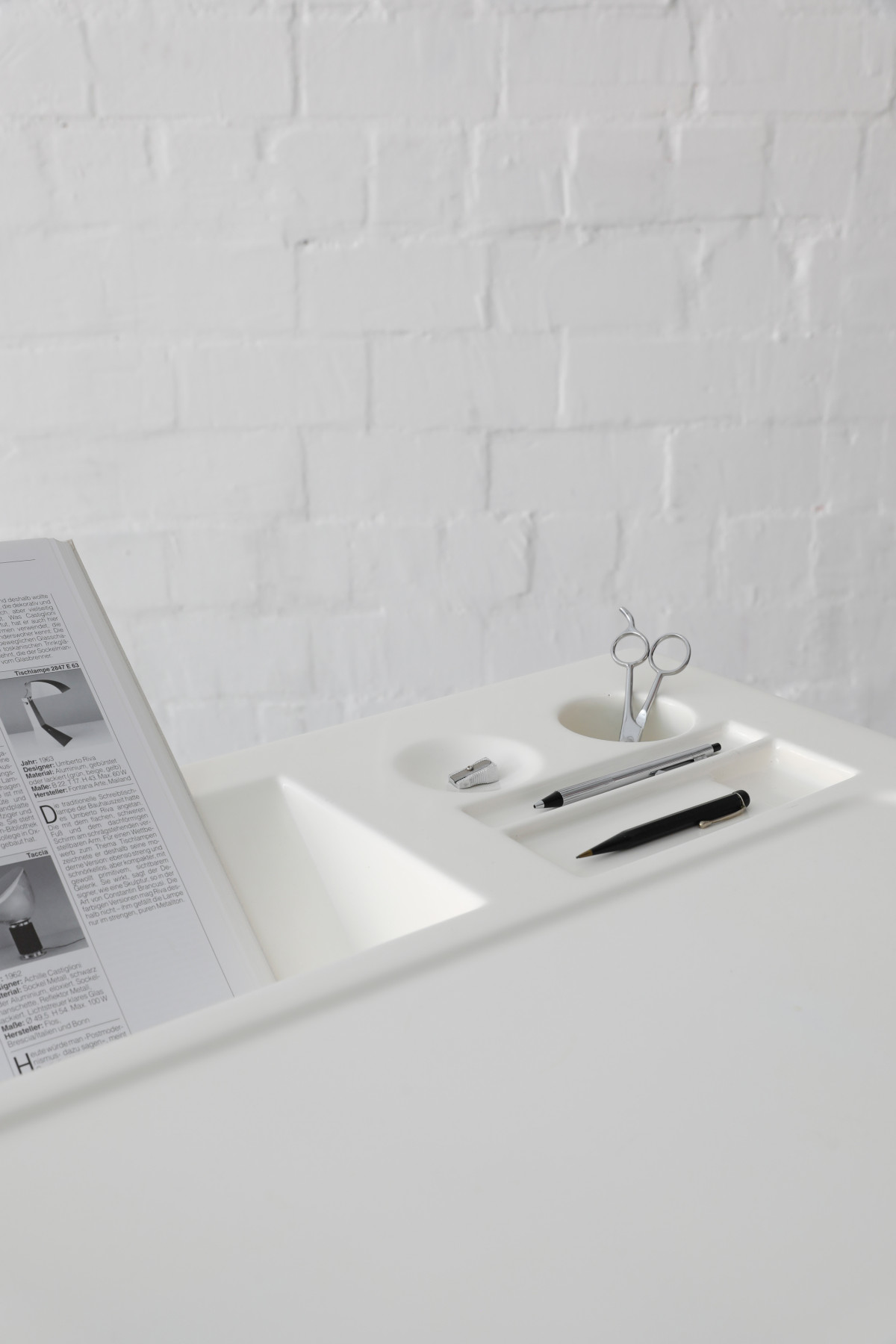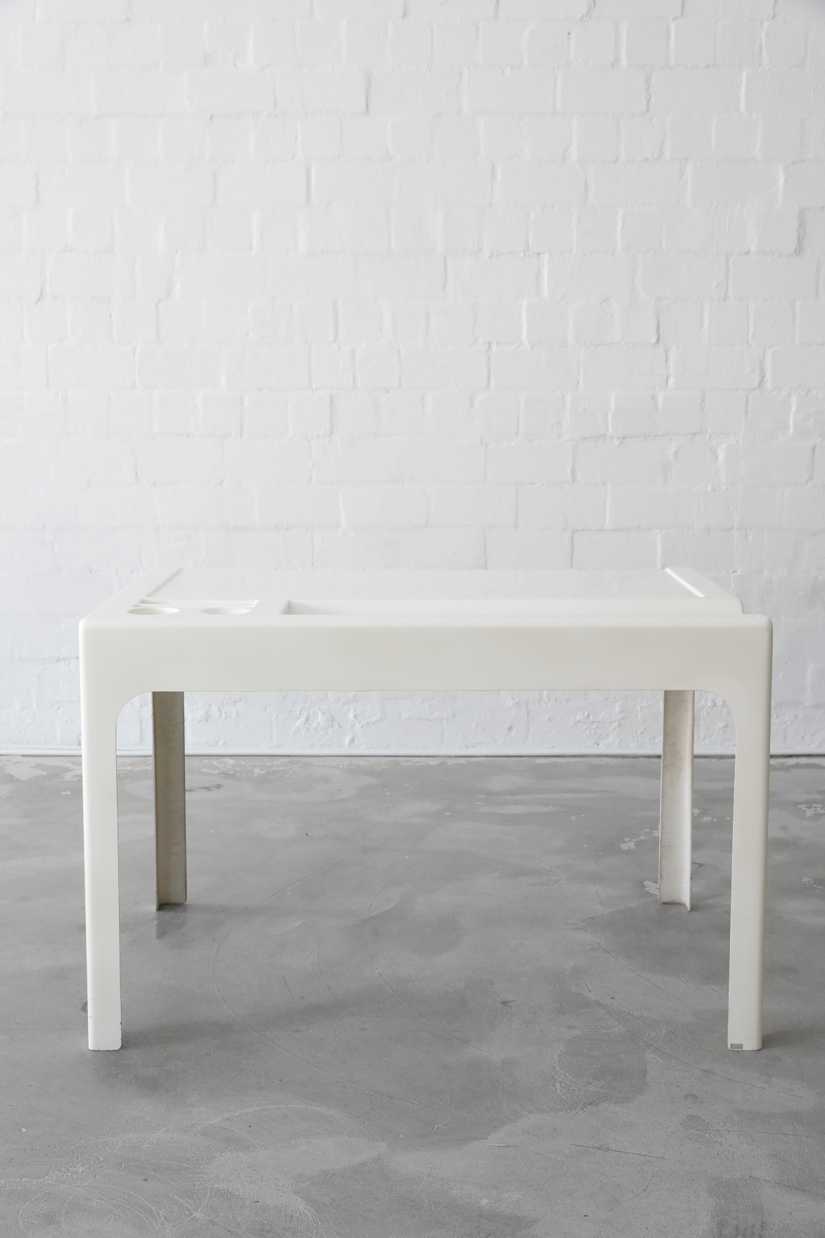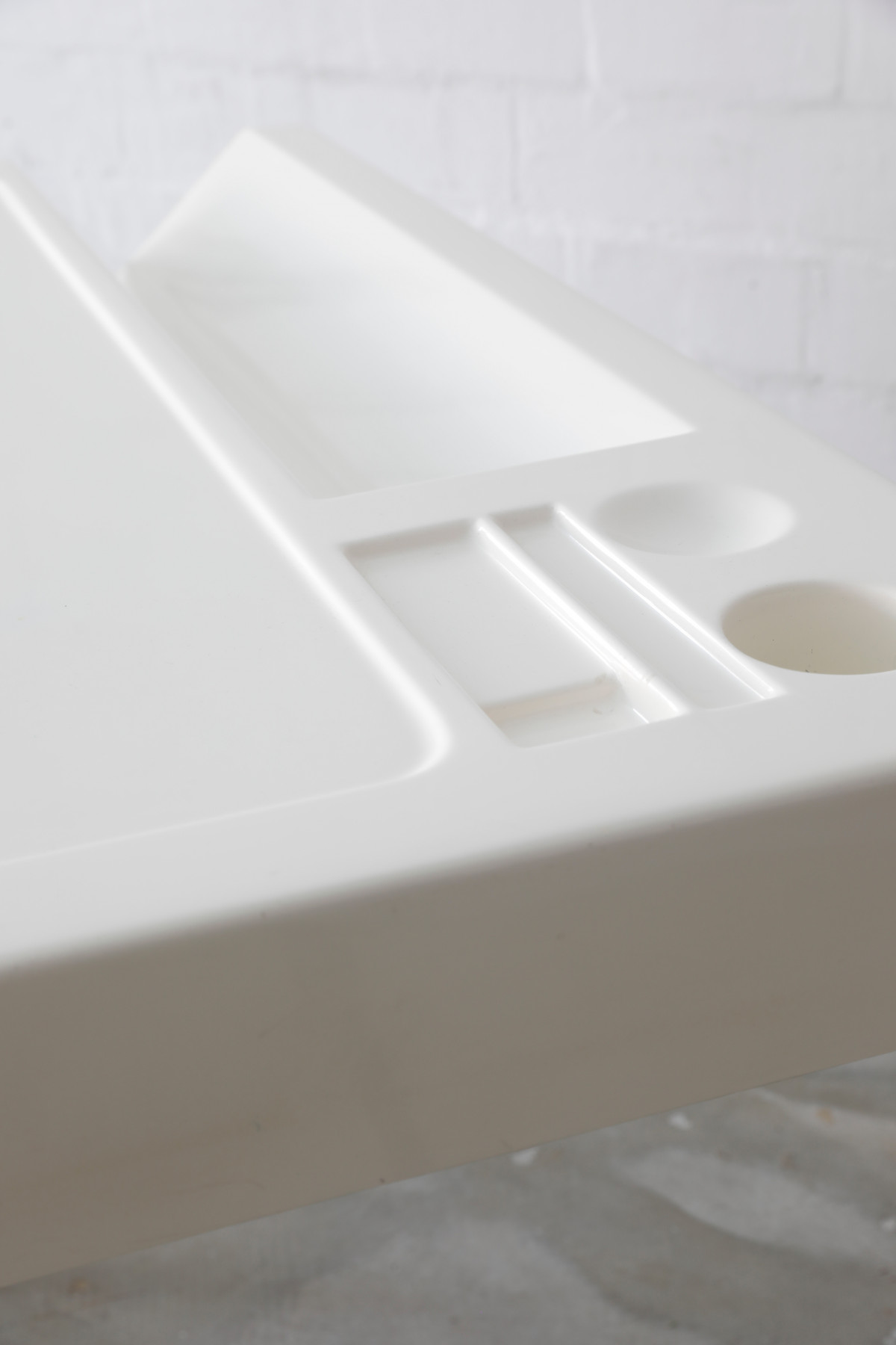 Rare Ozoo Space Age writing desk by Marc Berthier for D.A.N. Paris, 1960s. White fiberglass structure and cute little details for books and storing pens. Here in combination with the Artemide Selene Chair and this beautiful Martinelli Luce Lamp.
